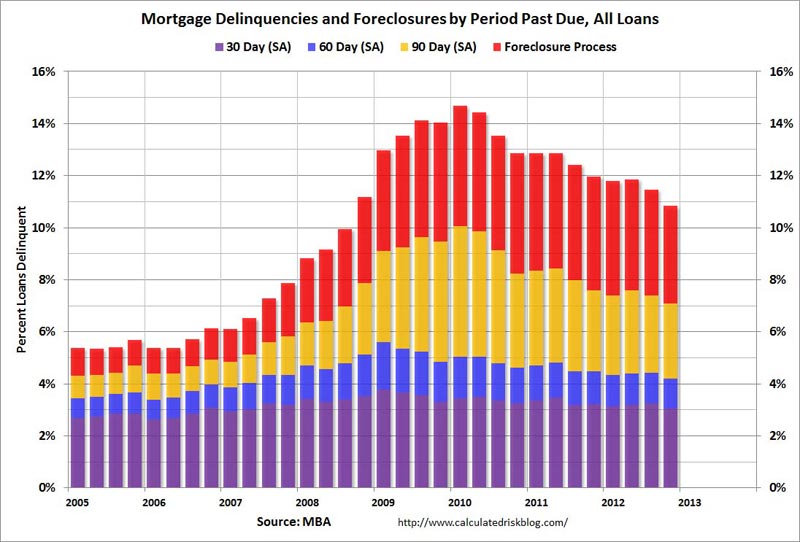 So, with 9.8 million vacant housing units in the country and 1.6 million of these identified as for sale, the NAR and media mouthpieces have the balls to report only 1.74 million homes for sale in the entire U.S. This doesn't even take into account the massive shadow inventory stuck in the foreclosure pipeline. Of the 75 million owner-occupied housing units in the country, 50 million have a mortgage. Of these houses, a full 10.9% are either delinquent or in the foreclosure process. This totals 5.4 million households, with 1.9 million of these households already in the foreclosure process. The number of distressed households is still double the long-term average, even with historically low mortgage rates, multiple government mortgage relief programs (HARP), and Fannie, Freddie and the FHA guaranteeing 90% of all mortgages. Do you think the NAR is including any of these 5.4 million distressed houses in their inventory numbers?