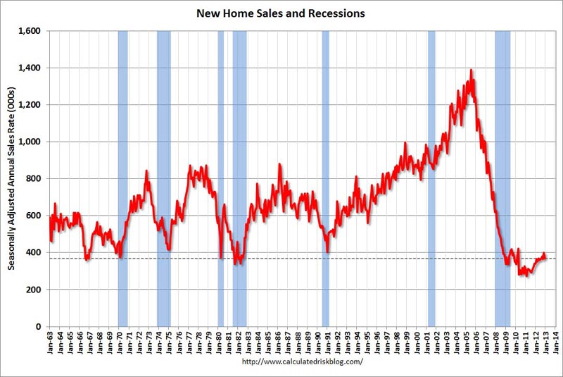 The media, NAHB, and certain bloggers look at this chart and declare that new home sales are up 20% from 2011 levels. Sounds awesome. I look at this chart and note that 2011 was the lowest number of new home sales in U.S. history. I look at this chart and note that new home sales are 75% below the peak in 2005. I look at this chart and note that new home sales are lower today than at the bottom of every recession over the last fifty years. I look at this chart and note that new home sales are lower today than they were in 1963, when the population of the United States was a mere 189 million, 40% less than today's population. Do you see any signs of a strong housing recovery in this chart?