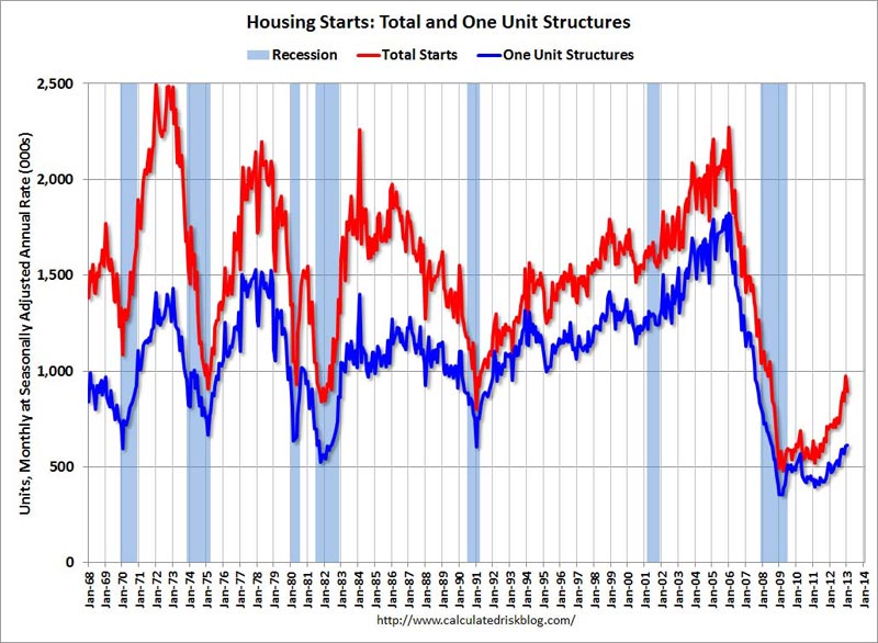 The housing cheerleaders look at the chart below and crow about a 75% increase in housing starts. I look at this chart and note that housing starts in 2009 were the lowest in recorded U.S. history. I look at this chart and note that total housing starts are down 60% and single family starts are down 70% from 2006 highs. I look at this chart and note the "surge" in housing starts is completely being driven by apartment construction, because the student loan indebted youth can't afford to buy houses. I look at this chart and note that housing starts are 40% below 1968 levels. Do you see any signs of a strong housing recovery in this chart?