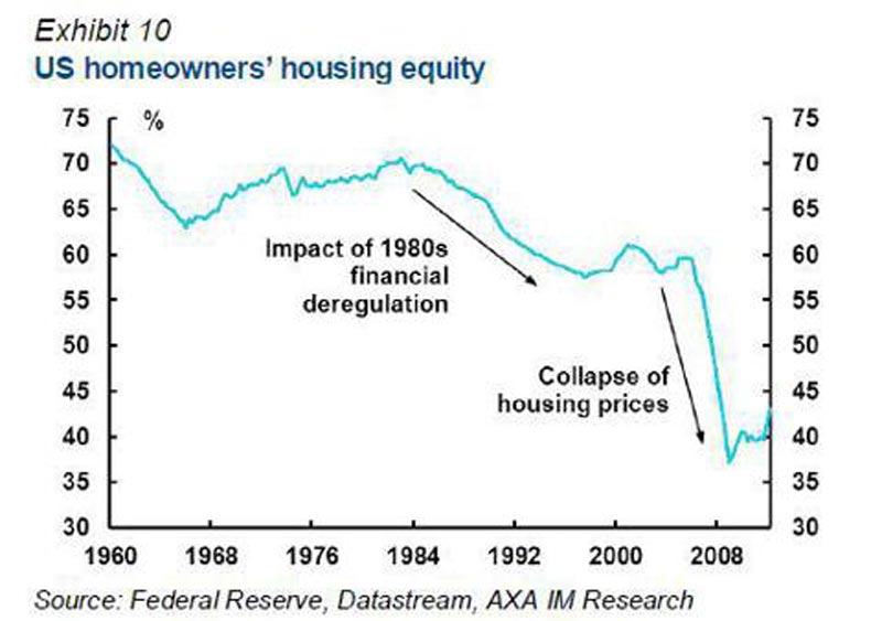 Despite the propaganda, hyperbole, and cheerleading from the corporate media, the fact remains that national homeowner's equity is barely above its all-time low of 38%, down from 62% in 2000 and 70% in 1980. The NAR shills, Federal Reserve drug pushers, Wall Street shysters, and pliant media lured the middle class into the false belief that housing was an asset class that could make you rich. Homes became the major portion of middle class net worth. As prices were driven higher from 2000 through 2006, the middle class took the bait hook line and sinker and borrowed billions against their ever increasing faux housing wealth. This set up the impending collapse of middle class net worth, created by the 1%ers on Wall Street, in Washington DC, and in corporate executive suites across the land. The median American household lost 47% of its wealth between 2007 and 2010. Average household wealth, which is skewed dramatically by the richest Americans, declined by only 18%. Real estate only accounts for 30% of the net worth of the rich. For the middle 60%, housing has risen from 62% to 67% of total wealth since 1983. Middle class families' saw their cash cushion fall from 21% in 1983 to 8% before the crash. They were convinced that living on Wall Street peddled debt was the path to prosperity. After the crash, the middle class has been left with no cash, underwater mortgages, declining real wages, less jobs, and a mountain of credit card debt. Delusions have been crushed. But an on-line degree from the University of Phoenix funded by a Federal student loan of $20,000 will surely revive the fortunes of the average unemployed middle class worker.