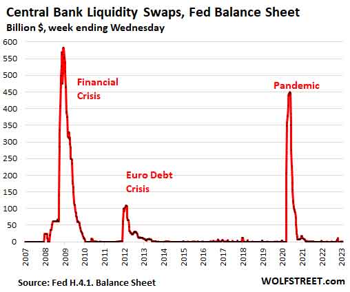 Keeping an eye on potential warning signs. Central Bank Liquidity Swaps.The Fed has long had swap lines with major other central banks, where that central bank can swap local currency for US dollars with the Fed, via swaps that mature over a certain time period, such as seven days, at which point the Fed gets its dollars back and the other central bank gets its currency back. There are currently only $427 million (with an M) in swaps outstanding: