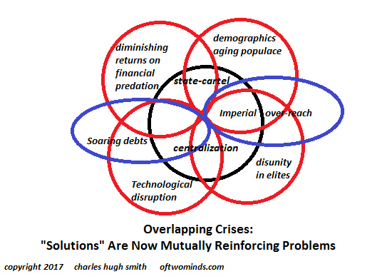 But the flaw is never an easily modified policy tweak; it's intrinsic to the "solution" itself. Just as markets lack mechanisms to recognize, much less price in, externalities and internalities that manifest in the future in complex ways, Central Planning has intrinsic fatal flaws that I described in my book Resistance, Revolution, Liberation. The ontological imperative of Central Planning is to view the expansion of state power as the solution to every problem. This expansion of power comes at the expense of some other node of social-economic power such as local governments, enterprises and social (i.e. non-political) organizations such as community hospitals, charities, commissions, etc. This intrinsic imperative to ceaselessly expand regardless of how many failures pile up manifests in a number of ways. One is that the agencies of central planning never close down because they solved the problem they were launched to address: the agency either expands as a reaction to its own abysmal failure to solve the problem, or it engages in mission creep and declares its success grants it the right to start solving other problems beyond its original charter. This is the organizational equivalent of the Peter Principle: every agency rises to the highest level of its incompetence, and then proceeds to expand its reach and power as the solution to its incompetence. Central Planning is in bed with corporate monopolies and cartels, the private-sector equivalent of centrally organized, power-hungry agencies. Corporations grease political fundraising, and are "helpful" when retiring bureaucrats need a lucrative second career as lobbyists, board members, etc.--the infamous revolving door. It's a match made in Heaven. If Central Planning can't expand its power, it expands its budget, at the expense of its programs. This process--the decay from idealistic can-do to self-serving muddle-through--is depicted in the Lifecycle of Bureaucracy chart: