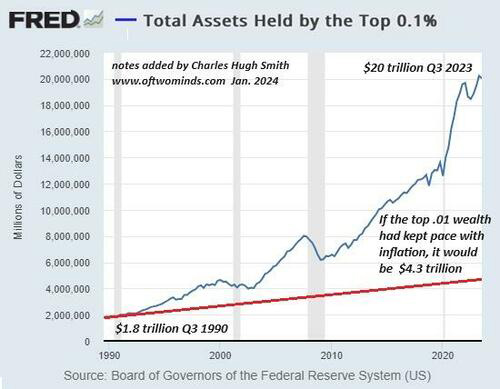 It seems at least some households are realizing they need to rein in spending. This reality is obscured by statistics which distort the financial security of average households. As always, we have to separate the top 10% who collect 40% of the income and own about 90% of the financial assets from the bottom 90%, as the top 10% distort the risks faced by the bottom 90%. If we include the top 10% and look at all households, the average looks fine, because the wealthiest few skew the median and average upward. If we take total household wealth and divide by the total number of households, it gives the impression that households are doing great--look how much wealth the average household owns. But this is a distortion. Remove the top 10%'s wealth and income and then re-do the calculation, and then repeat it for the bottom 50% of households. You end up with a much more accurate and much less rosy snapshot of American households' relative precarity. As the chart below illustrates, the share of financial assets owned by the bottom 50% of households rose a meager 0.2% to 2.6% despite trillions of dollars of stimulus flooding the economy. It's common knowledge that most of the tsunami of cash distributed in pandemic stimulus to the bottom 90% has been spent. Once again, looking at all household savings / cash is deceptive, as the savings of the top 10% have risen because they didn't need the pandemic largesse and just stuffed the extra cash into their investment accounts. There are many signs of belt-tightening, if we care to look for them. Short-term rentals that were solidly booked now have low occupancy /bookings. Pawn shops are finding that the goodies snapped up with pandemic cash are being pawned and not being redeemed. Restaurant traffic is down. We're also seeing accounts like this, of households with $200,000 in income realizing there's nothing left of that income at the end of the month unless they trim their free-spending habits. We're struggling to make ends meet: our 6-figure salaries aren't enough to support our lifestyle anymore. When it comes to cutting low-value expenses, there is a tremendous quantity of low-hanging fruit in many U.S. household budgets. Many costly mobile phone plans are bloated with unused services or bandwidth, while low-cost mobile providers offer plans at $15/month. (Which is why the big telecoms are offering teaser rates of $15/month for a year. After that, you pay the same old bloated rate.) Cable TV has been losing customers for years, yet the cost of basic cable keeps rising. Our local provider's basic TV service is now $80/month, with a $23/month "broadcast TV surcharge" and $10 in taxes and fees, for a total of $113/month for trash TV filled with adverts. No wonder I see people waiting in line to return their cable TV box: $1,350 a year for what? Many households have multiple streaming services they can't possibly watch enough of to justify the ballooning cost of these services. (One weird trick: choose one streaming service and go back to reading books borrowed for free from the library.) Healthcare insurance is another high-cost burden that can sometimes be lightened by switching plans or coverage. Under-utilized gym memberships is another low-hanging fruit. Fast food, junk food and sweetened beverages is another high-cost, low-value budget item begging to be slashed and burned. Everyone talks about comfort foods, but having some savings is comforting, too, as is improving one's health. Many households are frugal by necessity, others are frugal by nature, and others are becoming frugal via disciplined budgeting in service of common-sense financial goals such as having some savings as a buffer against unexpected expenses. As noted in "Outlawing" Recession Has Made a Monster Recession Inevitable, few households anticipate extended periods of unemployment in their future. Jobs are plentiful and the general expectation is they will remain so. But recessions transform abundance to scarcity faster than we might imagine, and so prudence suggest thinking through what we'd do if one of the primary earners loses their job and can't find a replacement job at the same rate of pay. Should any of the "everything" bubbles pop, even the top 10% might be stunned by a reversal of fortune. When households earning over $200,000 are complaining they can't make ends meet, imagine what they'll feel if their bonuses and investment income plummet, or a high-earner loses their job. The trickle of budget-tightening we're seeing now could turn into a flood that washes away corporate sales and profits in ways that few even believe is possible. But real recessions don't just trim the fat, they atrophy muscle, too, and they don't end in three months. Those who slash spending before the recession turns abundance into scarcity will be better prepared than those maxing out their credit card living large and then getting a layoff notice. The bottom 50% are already in precarious financial straits: