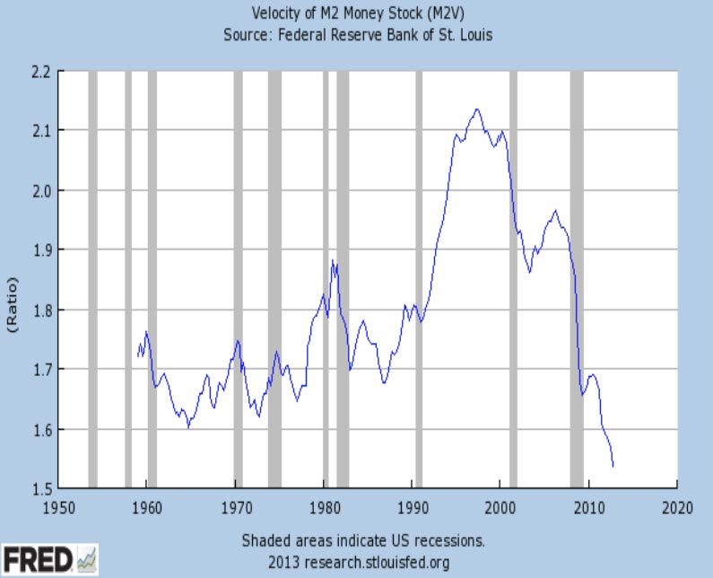 Yesterday I discussed the possibility that the US economy has slipped into a deflationary morass and I seemed to have touched a nerve. As a result I want to continue discussing the idea that deflation, not inflation, now has the upper hand in the US economy. We all know that the Fed has been easing since 2009, and it recently raised the bar to include US $85 billion/month in bond purchases. As a result the Fed balance sheet is now filled with US $3.078 trillion in assets of dubious quality. I maintain that little or none of that liquidity has filtered out into the real economy, you and I, and as proof I told you to look at this chart of the Velocity of Money: