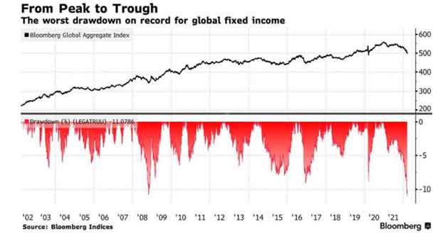 From Rigged to Fail to Just Plain Failing Just two years ago, I wrote a book warning that Western markets in general, and US markets in particular, were Rigged to Fail. Well, now, in real time, they are failing. This hard reality has less to do with COVID or the war in the Ukraine and more to do with one simple force, which euphoric markets and clueless leaders have been ignoring for decades, namely: Debt. As I wrote then, and will repeat now: Debt destroys nations, financial systems, markets, and currencies. Always and every time. As we see below, the inflationary financial system is now failing because its debt levels have rendered it impotent to grow economically, react sensibly or sustain its chronic debt addictions naturally. The evidence of this is literally everywhere, from the Fed to the Petrodollar and the bond market to the gold price. Let’s dig in. The Fed: No Best-Case Scenarios Left The Fed has driven itself, and hence the U.S. markets and economy, into an all-too predictable corner and historically dangerous crossroads. If it turns to the left (i.e., more money printing/liquidity) to protect a record-breaking risk asset bubble, it faces an inflationary flood; if it turns to the right (and raises rates or tapers UST purchases), it faces a market inferno. How did we get to this crossroads? Easy: Decades of artificially suppressed rates, cheap credit and a $30T sovereign debt pile of unprecedented (and unsustainable) proportions. The Dying Bond Bull With so much of this unloved debt on its national back, no one but the Fed will buy Uncle Sam’s IOUs. As a result, long-dated Treasuries are falling in price and rising in yield as Bloomberg reminds us of the worst drawdown for global bonds in 20 years.