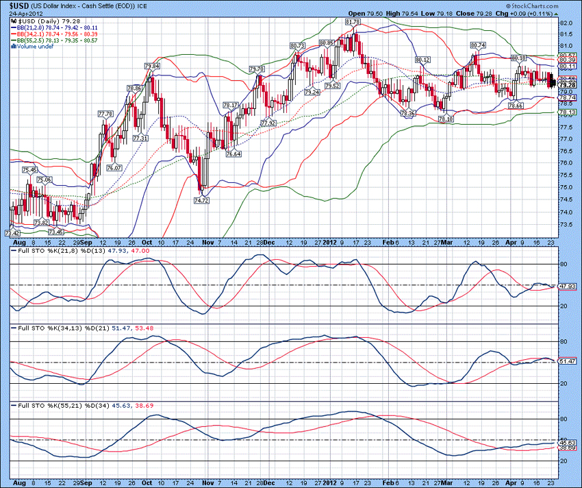 The daily chart of the Euro Index is shown below, with upper and lower Bollinger bands continuing to envelope the sideways price action. Full stochastics 1, 2 and 3 are shown below in order of descent, with the %K beneath the %D in all three instances. There is no sign of a bottom in the Euro at present, but is expected to be put in place sometime between mid to late May 2012. The Euro is expected to at least retest the 148 level relative to the US Dollar...in the past, other currencies were weaker than the USD at the former Euro high, but stronger currencies against the US Dollar Index will drive its value down to the 64-66 level (56-58 for a spike low). Figure 3