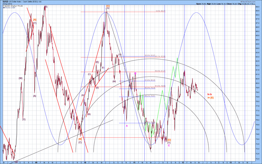 This article was presented to the benefit of subscribers of TreasureChests.info on Wednesday April 25th. Commentary is presented initially, followed by technical analysis of 3 currencies and the US Dollar Index and Gold, ultimately showing that a high probability is forming for a break to the upside in gold, primarily triggered by a large looming decline in the US Dollar Index. Over the past weekend, China announced that they would purchase Iranian oil through sale of gold beyond June 28 2012 in order to get around US sanctions that states no nation can sell oil in US Dollars This has profound implications going forward, as this will be the first time in nearly 70 years that the US Dollar as a reserve currency has been challenged. The article I penned back in 2003 titled "Whose Gonna Say Uncle" mentioned that block currencies will likely form due to localization of economies due to energy constrictions etc. The BRICS nations have primarily been the target of sabre rattling through the US government, so actions taken by China is likely to be conducted on a massive scale going forward as other nations seek better control over their own destiny. The BRICS nations are a force to be reckoned, with, from a financial and military perspective. Sabre rattling coming out of Washington is merely that...there is not much that they can do to save the US Dollar, as other nation blocks slowly attempt to create localized currencies. All major wars being fought at present are economically related as each country tries to stay afloat in an environment where an ever increasing amount of debt is created daily to prevent deflation (Note: This can only be put off for so long as the CFS cycle reaches its next downward turning point). As bickering and economic warfare continue up front along with the Bread and Circuses put on national TV to dumb down the masses, the page 16 story (As Donald Coxe refers to stories out of the eyes of the majority) unfolding is that gold is slowly being set up to be a major currency of exchange. Banks around the globe are quietly accumulating metal in order to preserve wealth for what lies ahead beyond 2020. Between now and 2020, gold is likely going to see a spike high between $7000-10,000/ounce (maybe higher) and then drop by 50% and baseline. Subsequently, a broad stock market rally beyond 2020 will be likely likely after ending a near 20 year bear market. During this time, governments will still have to inflate, but this will be the start of an inflationary cycle, which should see the DOW reach 200,000ish at some point this century, as per Glenn Neely's long-term forecast. As assets rise in price, it will still be important to have gold-backed currencies, as people 8 years out will not want a repeat of 2000-2020. Back here in good ol' 2012, we still have 8 years of tough sledding before we get through this mess and the only thing I have seen to somewhat guide with reasonable accuracy for turning points is the Contracting Fibonacci Spiral first observed last July. The target date for the broad markets putting in a high is between September 12, 2012 and March 6th, 2013, with December 6th 2012 as the ideal mid point. During other cycles, the S&P has remained buoyant after putting in a high while other sectors of the economy rally. The CFS date for gold I believe is September 13th, 2013, which could occur as early as May 2013. Given the expected decline in the US Dollar Index starting anytime between mid May to early June, this suggests that a 10-12 month rally in precious metal stocks and commodities is likely. At present, there is no shortage of liquidity and we are nearing the stage where funds are rotating into under performing sectors. Within the CFS, declines are noted by sharp periods of deflation, such as that witnessed in 2008. The next round of deflation is starting to appear as is if it will occur between May 2013 and August 2013 and last until late 2014. As we reach the point of singularity in 2020, market volatility is going to be at levels never seen before. The one sector witnessing a large counter trend relative to the broad stock market indices is the precious metal arena AKA the AMEX Gold BUGS Index. This has been the one sticking point with the CFS which is seeing gold stocks marching to the beat of its own drummer at present. As mentioned current lows in the HUI will represent a generational low relative to the price of gold. On Friday, the HUI/Gold ratio gapped down to 0.26 and has two daily hammer doji's in place. It is important to note that the 2008 lows saw a spike low value of 0.20, which was a spike low. Values quickly bounced up to 0.25 and trended to near 0.45 before declining. At present, we have gold above $1600/ounce, while gold stocks are priced as if gold was $700/ounce. With gold set to move higher with continued money printing campaigns, it only makes sense that gold stocks rise accordingly. By Christmas time, everyone in PM's should have something to smile about, with the top expected sometime between April and June 2013 in the HUI. The above information is how things are thought should logically progress before we hit the next wave of deflation (It will be far more severe than 2008). As mentioned before, avoid adding further positions to PM stocks until we have a clear indication that a bottom has been put in place. Accompanying this text are related charts of 3 currencies, the US Dollar Index and one chart of Gold illustrating that a breakout to the upside is looming. CurrenciesThe daily chart of the Canadian Dollar Index is shown below, with a closing value of $101.31, just at the upper point of resistance. All three lower Bollinger bands are in close proximity to each other, and if they begin to curl down, it will indicate the Loonie is set to climb higher. An inverse head and shoulders pattern appears to have been put in place, which has a measured move of 12 cents, or $1.13 relative to the US Dollar Index. Our target for the Loonie in 201