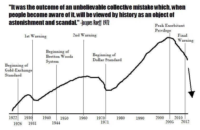 Those of you who have been reading my blog for a while should be aware that the U.S. has run a trade deficit every year since 1975. You should also know that, since 1971, the U.S. government has run its national debt up from $400B to $15,500B, and that foreign Central Banks buying this debt have been the primary support for both the relatively stable value of the dollar and the perpetual nature of the U.S. trade deficit. But it wasn't always this way. Before 1971 the U.S. was running a trade surplus and the national debt level was relatively steady during both the gold-exchange standard and the Bretton Woods era. During the gold-exchange standard the national debt ranged from about $16B up to $43B. It increased a lot during WWII to about $250B, but then it remained below its $400B ceiling until 1971. Another big difference during this timeline which I have already mentioned is the flow of gold. The U.S. experienced an uncontrolled inflow of gold from the beginning of the gold-exchange standard until 1952, and then a stunted outflow ensued until it was stopped altogether in 1971. The point is that with such a wide array of vastly disparate circumstances, it is a bit tricky for me to explain the common thread that binds this timeline together. Very generally, let's call this common thread the monetary privilege that comes from the rest of the world voluntarily using that which comes only from your printing press as its monetary reserves. It started as a privilege, grew into an exorbitant privilege 35 years later, and then peaked 45 years later at something for which, perhaps, there is not an appropriately strong enough adjective. Robert Triffin thought it had gone far enough to warrant warning Congress in 1960, but just wait till you see how much farther it went over the next four and a half decades. But first, let's go back to 1931. First Warning In his 1972 book [6], Jacques Rueff writes: