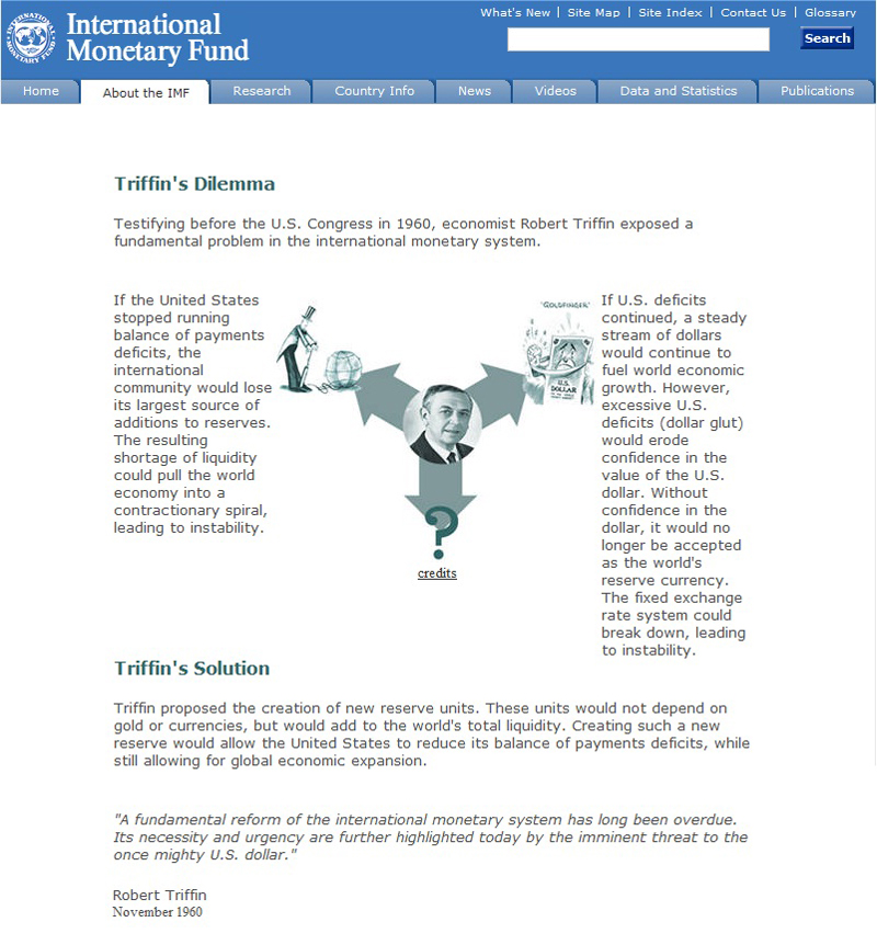 The Secret of a Deficit Without Tears [6]Second Warning By the early 1960s, Jacques Rueff was not alone in speaking out against the American privilege embedded in the monetary system. Another Frenchman named Valéry Giscard d'Estaing, who was the French Finance Minister under Charles de Gaulle and would later become President himself, coined the term "exorbitant privilege". [7] Even Charles de Gaulle spoke out in 1965 and you can see a short video of that speech in my post The Long Road to Freegold. But perhaps more significant than the obvious French disdain for the system was Robert Triffen, who stood before the U.S. Congress in 1960 and warned: "A fundamental reform of the international monetary system has long been overdue. Its necessity and urgency are further highlighted today by the imminent threat to the once mighty U.S. dollar."To put Triffin in the context of our previous discussion, here's what Jacques Rueff had to say about him: "Some will no doubt be surprised that in 1961, practically alone in the world, I had the audacity to call attention to the dangers inherent in the international monetary system as it existed then.And here is what Wikipedia says about Robert Triffin's Congressional testimony: "In 1960 Triffin testified before the United States Congress warning of serious flaws in the Bretton Woods system. His theory was based on observing the dollar glut, or the accumulation of the United States dollar outside of the US. Under the Bretton Woods agreement the US had pledged to convert dollars into gold, but by the early 1960s the glut had caused more dollars to be available outside the US than gold was in its Treasury. As a result the US had to run deficits on the current account of the balance of payments to supply the world with dollar reserves that kept liquidity for their increased wealth. However, running the deficit on the current account of the balance of payments in the long term would erode confidence in the dollar. He predicted the result that the system would not maintain both liquidity and confidence, a theory later to be known as the Triffin dilemma. It was largely ignored until 1971, when his hypothesis became reality, forcing US President Richard Nixon to halt convertibility of the United States dollar into gold, an event with consequences known as the Nixon Shock. It effectively ended the Bretton Woods System." [8](For more on the Triffin dilemma, please see my posts Dilemma and Dilemma 2 – Homeless Dollars. And for a glimpse at what I view as an even more fundamental dilemma, you'll find "FOFOA's dilemma" in my post The Return to Honest Money.) As noted above, Triffin's prescription in the 1960s was at odds with Rueff and the French contingent. In fact, even today, the IMF refers to "Triffin's solution" as a sort of advertisement for its own product, the almighty SDR. [9] From the IMF website: Triffin's Solution ![]() But even though Triffin proposed something like the SDR (a proposal the IMF loves on to this day), I think that actions speak louder than words. Robert Triffin was a Belgian economist who became a U.S. citizen in 1942 after receiving his PhD from Harvard. He worked for the Federal Reserve from 1942 to 1946, the IMF from 1946 to 1948 and the precursor to the OECD from 1948 until 1951. He also taught economics at both Harvard and Yale. But in 1977 he reclaimed his Belgian citizenship, moved back to Europe, and helped develop the European Monetary System and the concept of a central bank for all of Europe which ultimately became the ECB five years after his death in 1993. Final Warning With the end of the Bretton Woods monetary system in 1971, three things (besides the obvious closing of the gold window) really took hold. The first was that the U.S. began running (and expanding) a blatant trade deficit. It went back and forth a couple of times before it really took hold, but starting in 1976 we have run a deficit every year since. [10] The second thing that took hold was something FOA called "credibility inflation". You can read more about it in my aptly-titled post, Credibility Inflation. This phenomenon, at least in part, helped grow the overall level of trade between the U.S. and the rest of the world in both nominal and real terms. In inflation adjusted terms, U.S. trade with the rest of the world is up almost eightfold since 1971. [11] The third thing was that the U.S. federal government began expanding itself in both nominal and real terms by raising the federal debt ceiling and relying more heavily on U.S. Treasury debt sales. From Credibility Inflation (quoting Bill Buckler): Way back in March 1971, four months before Nixon closed the Gold window, the "permanent" U.S. debt ceiling had been frozen at $400 Billion. By late 1982, U.S. funded debt had tripled to about $1.25 TRILLION. But the "permanent" debt ceiling still stood at $400 Billion. All the debt ceiling rises since 1971 had been officially designated as "temporary!" In late 1982, realizing that this charade could not be continued, The U.S. Treasury eliminated the "difference" between the "temporary" and the "permanent" debt ceiling. The way was cleared for the subsequent explosion in U.S. debt. With the U.S. being the world's "reserve currency," the way was in fact cleared for a debt explosion right around the world.Here are the debt ceilings through 2010 as found on Wikipedia: