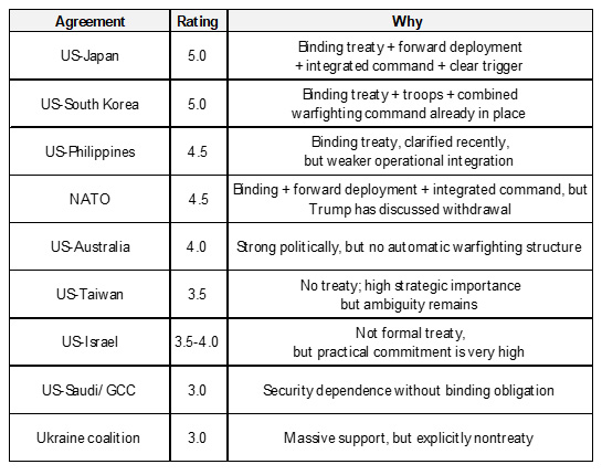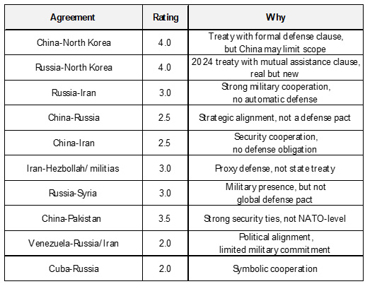 Below are what appear to be the most important treaties, the strength of the commitments implied by each of them on a 1 to 5 scale, and a brief description of each treaty. By and large, other measures of allegiances (such as leaders’ statements and actual actions taken) are aligned with these treaties. However, it is now clear that all these treaties, especially those with the US, are subject to change and that actual actions will speak louder than agreements.