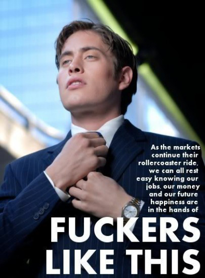 I tried saying something insulting to him, but he just talked right over me, lurching forward baring his laser-whitened teeth. "I'm sure you have the answer, you and Ron Paul and all the other pot-smoking libertarian do-gooders have it all figured out. But what I'm saying is, no confidence means end of the confidence game. That's what Lehman showed. Every single player in finance suddenly had to face the fundamental problem - this whole fucking economy is built on fraud and lies and garbage. So when Lehman collapsed, every single player panicked, going, 'If Lehman was nothing but a Ponzi scheme - and I know what I'm running is a Ponzi scheme - holy shit, that means everyone else is running a Ponzi scheme too! Run for the exits!' No one trusted anyone else, everyone pulled out, and the entire global economy collapsed just like that. And that meant your parents, my parents, every teacher, every fireman, every person in the country going into retirement, every price on every asset - wiped out. "And here's what I'm trying to get you to understand: In the grown-up world, when an entire country's savings accounts are wiped out because of some do-gooder and his law books and his Thomas Jefferson 'What about free and fair markets?' crap, that is a big problem - people don't give a fuck about Jefferson and 'free and fair markets,' they just want their savings to be worth something. And people are right: Jefferson was an imbecile. He should have been a folk singer, not a Founding fucking Father. But that's another issue that's over your head - the point is, the guy who destroys this economy because it's 'the right thing to do' will have to flee for his life, and whatever president or political party was in power when that decision was made will be out of power for the next 200 years. That's why Washington panicked and passed 'the bailout,' they didn't want to be the fools whom all the Ponzi victims blame for tanking the Ponzi scheme, so they broke the glass and pumped up a newer, bigger Ponzi scheme. It was an expensive 14 trillion dollar lesson in, 'Stay the fuck away from free-market experiments, assholes!' How naive are you people to actually believe that 'free market' crap? The problem is when people in power are stupid enough to listen to guys like you: all the do-gooder libertarians and the do-gooder free-market Republicans who forgot that they're supposed to lie. Hello!" "Libertarian, me? Since when was I ever a libertarian?" "That's my point: Fools like you don't even know who you are anymore. They forgot that they're supposed to lie about all that libertarian free-market shit, keep it far the fuck out of policy. But instead of just lying about free-markets while secretly propping up Lehman, the idiots actually tried pulling off a 'free-market' miracle, and we had to pay $14 trillion just to find out what I could have told them for no fee at all, which is: 'Hey, assholes, you're supposed to be hypocrites, OK? You're supposed to be two-faced free-market liars, not libertarian Quakers! You're not supposed to believe in anything - your job is to get up in front of the public and lie about free markets and the rest. Period.' "That's it, how fucking hard is it? Look, watch my face: Say one thing out of one side... and do the other out of the other side. Got that? Let everyone else whine and cry about, 'Ooh, that's not fair, ooh, that's a bailout, that's socialism, that's corruption.' That's what losers do - they whine. You, for example, Che - you whine all the time, and look at you... Can you pay the bill for this meal? Is there a libertarian on earth who can afford to buy a decent meal in Manhattan? And now, look at me: I'm a hypocrite. Hell yes I am! I lie every day of my life, I lie to myself in my sleep. Hell, I'm lying to you right now, in fact I don't even know what the fuck I'm saying anymore because I'm so used to lying. And yet - who's the guy with the black card? Who's the one who's going to pick up the check tonight? Guys with power, guys like me, we lie. You got that? 'Lie' as in 'My Lai' the massacre - as in, 'My Lai you long time, me so free-markety.' You distract the dumbshits with free-market B.S. because hey, for whatever reason, that's what the public likes to hear, it doesn't really matter what lie you feed them so long as it's the lie that puts them in a trance. And then behind the scenes, you do the very opposite: You fix the game, you cover up this problem here with those funds there, you move shit around, you skim budgets and you subsidize the system, you cover up the bad shit and once in a while throw a has-been to the wolves to keep the public entertained - that's the way the system works, and anyone who's an adult understands that. And everyone who doesn't understand that can go form an online libertarian chat group and complain with all their little libertarian friends about free markets and Jekyll Island and 'Wahhh! It's not not fair, waahhhh!'" "What's with the libertarian accusation?" "It's just that you all sound the same to me. Libertarians, hippies - is there really a difference? You all whine alike: 'It's not fair, man! Ooh! You can't do that, it's fraud, it's corruption, ooh no!' Or: 'It's the income inequality, man; Goldman Sachs controls us all man; it's socialism for the rich; it's all too scary for my retarded 5-year-old libertarian brain!' Seriously, anytime I meet libertarians like you - " "Listen - I'm not a fucking libertarian, OK? I want free handouts. How clear do I have to make this? Me - handouts. Me - Big Government. I want to collectivize your productive cash, because I am a resentful parasite. Are you capable of processing a single word of what I'm saying to you, Spaz?" "Uh-huh, sure, whatever. Here's the thing: I think it's great that you and your friends memorized Road to Serfdom in between Star Trek episodes - no really, I'm happy for you. Yeah, we're all so proud. But here's the thing: We grown-ups are really, really busy now trying to sort 