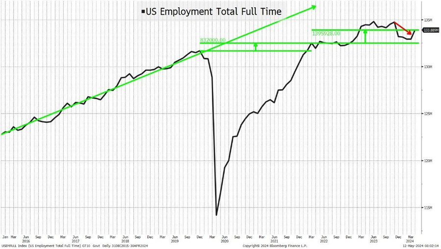 Peter Tchir explains why the consumer feels so bleak about the actually bleak economy that is being made to sound actually rosy. His full-time employment graph says in a picture what would take a thousand words: