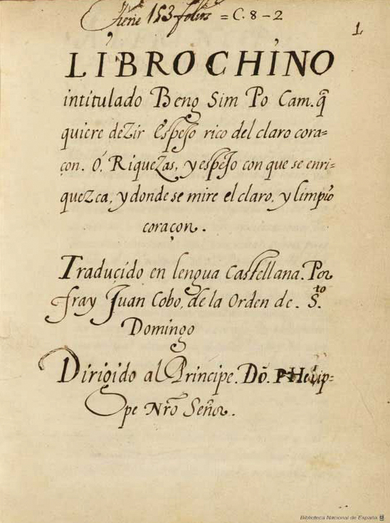 Inside page from this book printed in 1586 First translation of a classical Chinese text into a European language 1590 The Chinese book ‘Beng Sim Po Cam’ which means Rich mirror of the clear heart, or Riches and mirror with which it is enriched, and where one can see the clear and clean heart was translated into Spanish by Fray Juan Cobo around 1590 and printed in Manila in 159 ![]() ![]() Beng Sim Po Cam was published in a bilingual version