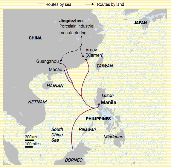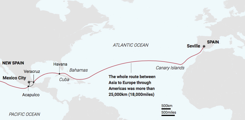 1537-1869: Spanish silver dollar Millions of coins are minted, spreading through Spain, the Americas and Southeast Asia. The consistent weight and purity sets the world standard Cultural and social legacy Just as trading goods for silver initiated economic bonds between Asia, Americas and Europe, the movement of people between continents would also lead to cultural and social exchanges. The 200 years of financial and cultural exchange which followed is now considered to be history’s first true globalisation Porcelain One of the most popular exports to New Spain and Europe was Chinese blue and white porcelain. In a 2016 archaeological excavation in Acapulco more than 3,000 pieces were found, demonstrating the kind of demand there was for this tableware. One of the characteristics of these pieces is that they were created exclusively by Chinese manufacturers for export to the American (or Western) market. These creations mixed Christian and Western elements as well as Oriental themes in the painted decorations. The pots from which people drank chocolate, then the height of fashion, were all made in China