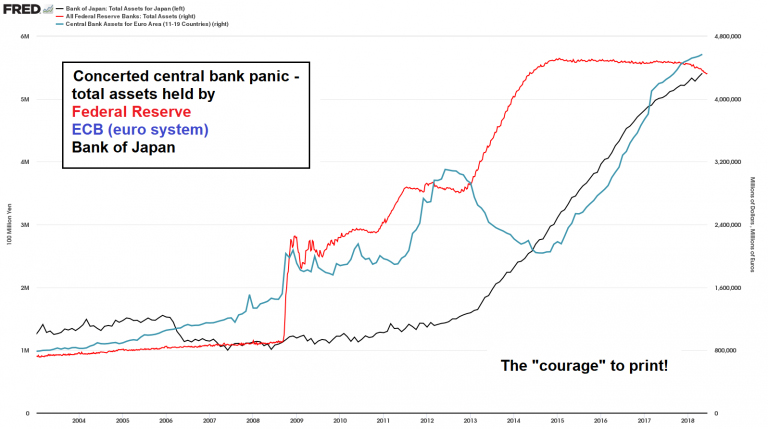 Amid the Madness This week Federal Reserve Chairman Jay Powell delivered the latest installment of the Fed’s public exhortation. The occasion was the Federal Open Market Committee (FOMC) meeting statement and press conference. Before we get to Powell’s remarks, however, some context is in order… Nearly a decade ago, when Lehman Brothers vanished from the face of the earth, and black swans relentlessly descended upon credit markets like common ravens upon fresh Southern California road kill, something utterly ridiculous happened. Money market shares of the Reserve Primary Fund did the impossible. They broke the buck – falling to $0.97 cents a share. Amid the madness, Ben Bernanke, the Fed Chair at the time, in what he later characterized as a courageous act, soiled his pantaloons… and then he soiled them again. He cut the federal funds rate to practically zero and began ravenously consuming toxic mortgage backed securities and Treasury notes, ultimately taking the Fed’s balance sheet from roughly $900 billion to over $4.5 trillion by early 2015. Pedal to the metal: central bankers in panic mode, all hitting the “Ctrl P” key command to save the inherently insolvent fractionally reserved banking system. [PT] Now, as Fed Chair, it’s Powell’s job to mop up Bernanke and Janet Yellen’s odorous mess. This mop up effort has generally been proceeding as follows… In December 2015, after seven years of zero interest rate policy, the Fed raised the federal funds rate a quarter of a percent. Then, in December 2016, they did it again. Last year, the Fed increased the federal funds rate three times, by a quarter of a percent each time. So far this year, the federal funds rate has been increased twice – with two more increases anticipated before year’s end. But that’s not the only mop up work the Fed’s doing. Starting in October 2017, the Fed began contracting its $4.5 trillion balance sheet. If they’re following their stated plan, the balance sheet should now be shrinking by $50 billion per month. Have you noticed that the status of the ongoing balance sheet reduction operation is not mentioned in FOMC meeting statements?