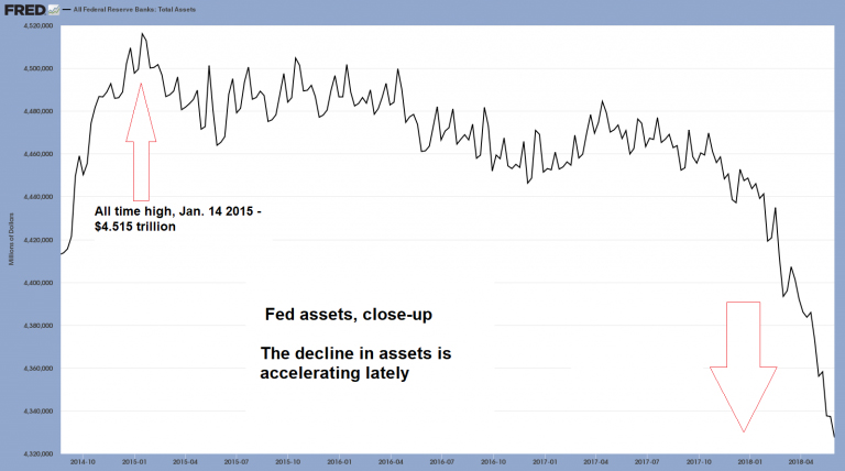 A close-up of the recent decline in assets held by the Federal Reserve system. [PT] Chasing the Wind On Wednesday, and within the above stated context, Fed Chair Powell delivered the FOMC’s latest remarks. As expected, the federal funds rate was raised a quarter of a percent to a range of 1.75 to 2 percent. The Fed also clarified that it is their intention to hike rates two more times this year. Powell also reaffirmed the Fed’s mandate to foster maximum employment and price stability, which, for reasons unclear, they consider to be 2 percent price inflation. Of course, he didn’t mention the Fed’s unstated mandate: To keep the big banks flush with credit and contrive a risk-free market where they can always borrow short and lend long, and pocket the spread for providing the world with the indispensable service of debt – and asset bubbles – without limits. All this is well and good, especially if you are a lender. But it supposes that the Fed’s whole attempt to plan the economy is within a framework of something that is completely under their control. This is patently false.