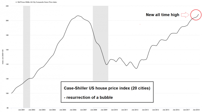US CPI, the Federal Funds rate and the supposed “target” for CPI – which after having been missed to the downside for a while is recently missed to the upside. The extent of “control” de facto seems to be roughly zero. Of course, if rate hikes and the shrinkage of the Fed’s balance sheet continue, prices will eventually respond – in particularly the giant asset bubble central banks have blown in recent years is set to deflate with a bang (once that happens they will panic again). [PT] The experience over the past century has demonstrated time and time again that the economy is beyond the Fed’s control. In fact, the Fed’s efforts to control it, via credit market intervention, actually compels the economy to convulse and recoil in spectacular ways. Raising the federal funds rate and reducing the balance sheet are, without question, mopping up the same liquidity that has floated up the stock market indexes well beyond what an honest man could possibly comprehend. This is also the same liquidity that has floated residential real estate prices above the epic 2006 high-water-mark. What will happen to these extremes in asset prices when the liquidity that has floated them up recedes? At the moment, Powell is raising the federal funds rate so that he can later cut it when the economy inevitably contracts. Similarly, he is reducing the balance sheet so that he can later increase it when the yield curve inverts and the big banks need another great big bailout. No doubt, today’s tightening policies will trigger tomorrow’s crisis response. Case-Shiller Index of US home prices: the bubble has been resurrected – hurrah! One guess what will happen next… [PT] These, folks, are facts of life in the year 2018. The Fed is chasing the wind… and taking us all for a wild smash-up ride. Charts by: St. Louis Fed Chart annotations, image captions and editing by PT