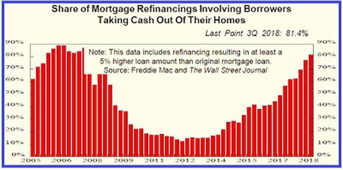 The Global Manufacturing PMI (Purchasing Managers Index) dropped to 50.4 – the lowest since July 2016. It’s been falling almost nonstop since mid-2017. The current period of decline is the longest in the 20-year history of the index. The index includes the purchase of inputs for the manufacturing of consumer goods, investment goods (capex material) and intermediate goods (semi-finished goods used as inputs for final goods). The pace of decline for auto sales in China, Europe and the U.S. is the fastest in at least three decades excluding the great financial crisis time period. Visible evidence of the contracting global/domestic economy is Ford’s announcement that it’s cutting 10% of salaried (white collar) workforce, about 7,000 jobs, by the end of August. The trade war is not the cause of U.S. economic weakness. If anything, it’s nothing more than an effort by the Trump Government to manufacture a scapegoat for the inevitably severe economic recession engulfing the system. China’s exports to the U.S. were 5% of its GDP in 1995. By 2005 exports to the U.S. had risen to 9% of China’s GDP. Currently exports to the U.S. represent just 3% of China’s GDP. These numbers show that the trade war between the U.S. and China is not the cause of global economic weakness. Rather, the cause is the massive misapplication of capital from 10 years of over $21 trillion in money printing and debt issuance. This artificially over-stimulated economic activity. Now that the stimulus has worn off, the major economies – especially the U.S. and China – face the problem of servicing their debt load and the consequences of a decade of misallocated capital. Bond guru, Jeffrey Gundlach, recently asserted in a webcast that “nominal GDP growth over the past five years would have been negative is U.S. public debt had not increased.” He went on to state that analysts and financial journalists “seem to not understand that the growth in the GDP it looks pretty good on the screen but is really based exclusively on debt – Government debt, also corporate debt and mortgage debt.” I have been saying this for quite some time because it’s pretty obvious to anyone who looks more deeply into the numbers beyond reciting the headline reports. The Fed released Q1 household debt numbers two weeks ago. It showed that total household debt grew by $124 billion in the first quarter of 2019, boosted by increases in mortgage, auto and student loan balances. That increase in debt is not translating into economic growth. Part of the reason for the increase in mortgage debt balances is the proliferation of cash-out refinancings, which are now back to 2006-2008 levels (chart sourced from bubblesbottoms.blogspot.com):