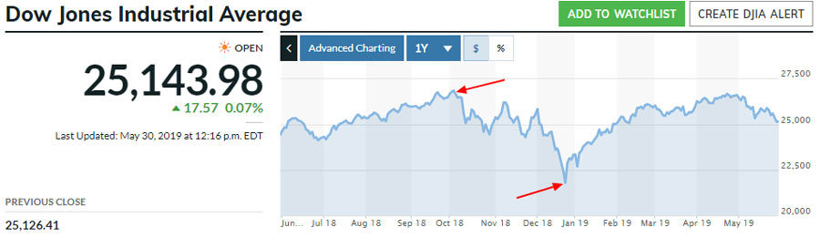 At the end of last year the Dow Jones suffered a severe correction from October 3 to December 24 (see both red arrows below): After recovering, the Dow now seems to be struggling to “stay up” since the end of April. Could this mean we are headed towards another major correction? Because of recent developments in the U.S.-China trade wars and Fed monetary policy, Frank Holmes seems to think so, writing in Forbes: