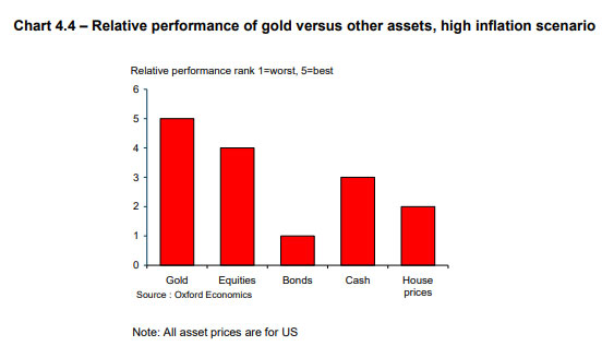 Food and energy are pretty important inflationary items to be ignored, especially if the trade wars trigger a situation where inflation gets out of control. According to official sources, inflation actually sits at 2.1% and is on the rise, despite Chairman Powell’s attempts to minimize it. Real inflation, reported at ShadowStats using older methodology, sits closer to 6%. It looks like this one-two punch of Fed policy and trade war negotiations may cause inflation to “run hot” in the near future, as Powell previously alluded to in March. Not a good outlook if it all plays out. The U.S. Economy May Struggle to “Get Back Up” This Time We are riding through a turbulent market on the cusp of a rapid inflation increase. Markets like this can do damage to retirement portfolios that aren’t resilient enough. Diversifying assets, considering various investment channels, and lowering risk exposure are tried and true ways to protect portfolios. Assets such as gold and silver should be considered for any portfolio “resilience” plan. As shown in the Oxford Economics chart below, gold is known for its ability to outperform other assets during inflationary markets: Even Frank Holmes brought attention to gold’s performance during times of high inflation, saying this is a favorable climate for the yellow metal. But don’t wait till after inflation has run too hot. The time to seek out the security and benefits of safe haven assets is now.