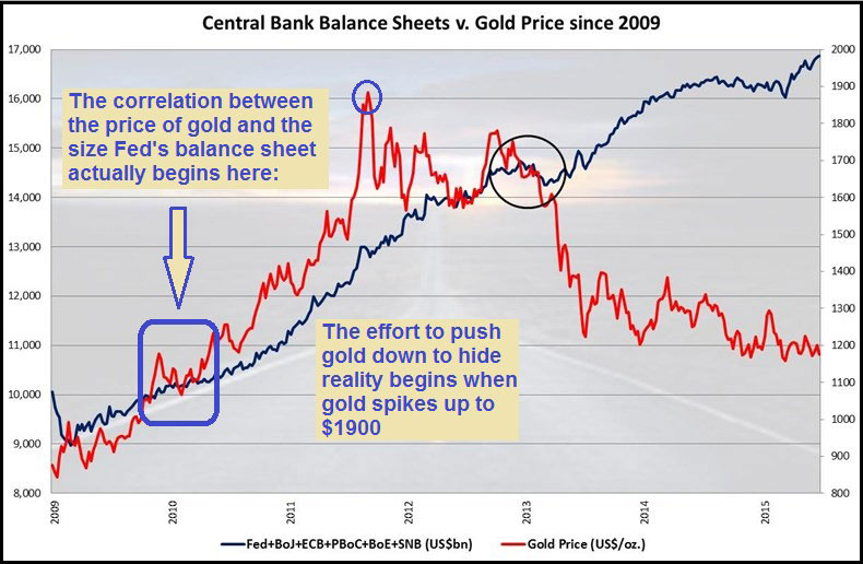 “Edward Bernays was Sigmund Freud’s nephew. He believed that the population had to be manipulated in a democracy to keep order. As I mentioned yesterday, Bernays was instrumental in getting women to smoke for his cigarette company client and to get the American people to support a CIA overthrow of a Guatemalan government that was uncooperative with United Fruit Company. Bernays uses the lowest instincts of humans and appeals to those “animal spirits” over their better judgement to influence mass viewpoints.” This summary of the roots of modern U.S. propaganda techniques was sent to me by Jay Taylor, LINK. Josef Goebbels implemented Bernays’ theories and techniques in crafting the infamous Nazi Germany propaganda machine. As Naom Chomsky chronicles in his preface to Bernays’ book, “Propaganda,” the U.S. Government and U.S. corporations hired Bernays in late 1920’s in order to utilize his techniques on the American public. The rest, as they say, is history…anyone remember 9/11? The propaganda effort against gold was ramped up starting in mid-December 2014. Around the same time, the blatantness of the effort to push down the price of gold and push up the S&P 500 and Dow intensified. Both John Embry and I independently noticed both occurrences. If it looks, walks and quacks like a duck… The anti-gold propaganda took on extraordinary proportions last week as a prelude to Sunday nights vicious paper raid on the price of gold. The media’s anti-gold media terrorism culminated with this silly, farcical article entitled, “Let’s Be Honest About Gold: It’s a Pet Rock.” Perhaps the most absurdly misleading article ever written about gold. Paul Craig Roberts was at one time an editor and columnist for the Wall St. Journal. He told me yesterday that he hasn’t been able to pick the WSJ to read for many years because of the high degree of fraudulent propaganda it now publishes. I bet most of you were not aware that the WSJ is owned by the same propagandist who owns Fox News – Rupert Murdoch. It was also around December that I started writing analysis of the economic data which showed that the U.S. economy was starting to hit a wall. The most obvious signal was the fact that retail sales declined .9% in the month of December before the effect of inflation is removed. I am convinced that the effort to push down the price of gold, and the corresponding media effort to publish highly misleading and negative reports about gold is directly related to an effort to cover-up the fact that the U.S. is systemically starting to collapse. The elitists running the system know better than any of us what is really going on in the real economy as they have access to the unmanipulated, raw data – something to which they go to great lengths to prevent we plebeians from seeing. The greatest amount of effort to cover up the truth about what is happening beneath the surface headlines is the effort being exerted to push the price of gold lower. The truth is that the U.S. nothing a but gigantic bloated, debt-addicted Ponzi scheme that is quickly losing its global economic and military hegemony while the U.S. elitists steal everything in sight from the middle class. If gold were allowed to trade freely, it would be priced at a significantly higher level than where it is now. The problem is that a rising price of gold would signal to a large portion of the population that something is drastically wrong with the U.S. financial, economic and political system. Perhaps the “poster child” for the propaganda and “thought control” behind the effort to drive the price of gold lower is this graphic which shows the price of gold in relation to the size of the Fed’s balance sheet (source: Paul Mylchreest, Gold and the Silver Stand-off, edits are mine):