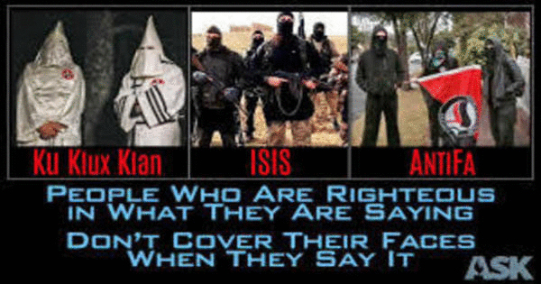 Like their Isis Muslim comrades and most Muslim women, they dress in black uniforms and black masks and hoods. Of course they are too cowardly to show their faces, and black just happens to be the color of Nazi SS dress uniforms and the favored clothing style of Satanists. But then leftists and Muslims are rather thinly disguised Satanists. If the left ever attains complete control, Antifa, racist Blacks, and MS-13 types will be the concentration camp guards and we patriots will be the (short-lived) inmates.