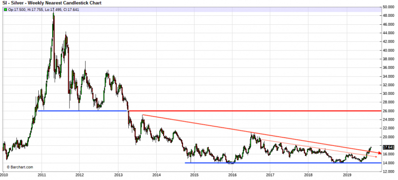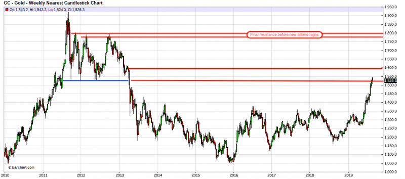 As the U.S. economy begins to contract—and make no mistake, all of this Trade War stuff is having a significant impact —The Fed will be forced to take more extreme measures. Not only will fed funds trend back toward 0.00-0.25% in the months ahead, additional QE programs will be announced. All of this will combine to shed further light upon the lies and illusions that the central planners have put forth for the past ten years. What follows will be a deepening loss of faith in your local fiat currency, and this will lead to an increasing bid for precious metals in all their forms. Already, the price of gold is at ALL-TIME highs in more than seventy currencies, chief among them the British pound and Canadian dollar. The price of gold in euros will be the next to reach a new all-time high. The price of gold in U.S. dollars will be next. As you consider the likelihood of all this, keep in mind something VERY important shared with us a few weeks ago by Rick Rule of Sprott USA. Over the past forty years, the share of global investment assets dedicated to precious metals and mining shares has ranged from a high of 8.0% in 1980 to a low of 0.5% in 2018. The median of this range is 2.5%. What do you think will happen IF, as prices move to new all-time highs in dollar terms, the notional amount of investment assets dedicated to the precious metals sector just goes back to the median and increases five fold? Recall your Econ 101 class. More dollars chasing a finite amount of goods leads to higher prices. Always. Here's the link to the Sprott Money News Weekly Wrap-Up where Rick laid out the case. If you missed it two weeks ago, you should definitely have a listen now:https://www.sprottmoney.com/Blog/sprott-usas-rick-rule-no-market-goes-straight-to-heaven.html Finally, what does all of this mean for COMEX gold and silver? Back in January, when we first forecast "the best year for the precious metals since 2010", the goal was $1500 gold and $20 silver before year end. However, as I type, COMEX gold is $1550 and COMEX silver is within 10% of $20. For COMEX gold, THE KEY was the weekly close above $1525. That level had held as important support from September 2011 through April 2013, so that meant it would also be significant resistance on the way back up. Now that price is above that level, we can set our sights upon an eventual return to the old all-time highs above $1900. Of course, price won't head directly there, and it will continue in the two-steps-forward-one-step-back pattern that is found in nearly all bull markets. But, from here, the next target is $1595, and beyond that, the psychologically-important round numbers of $1700 and $1800, with $1800 being the final hurdle before an assault on the old highs of $1920 can begin. A timeline for all of this? It depends upon how quickly the central banks and, more importantly, The Fed reverse course and aggressively move to cut and print. Given the current COMEX market internals, let's shoot for $1595 by mid-late September and then $1650 or so before the Dec19 contract goes off the board in November. That would mark a 30% gain for 2019. Not too shabby, and almost exactly the same gains seen back in 2010.