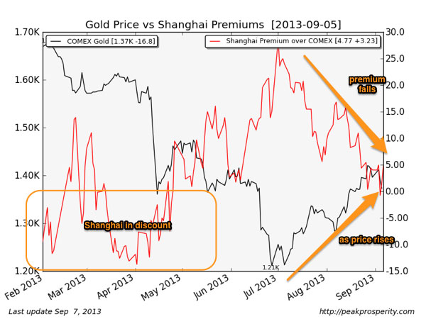 COMEX continues to lose gold, the GLD ETF is back to a modest outflow, gold premiums in Shanghai remain positive and are up slightly; the picture is modestly gold-price-positive. With India resuming imports of gold, it will be interesting to see what the supply picture looks like next week. Here is a longer term physical supply perspective - the past seven months of the premiums in Shanghai compared to the price of gold. I've noticed that some places just post charts when Shanghai is in premium, but I don't see any talking about it when it moves into discount. Just this week, Shanghai gold moved into discount for one day. That's not the end of the world, but given the chart below, do we think it is likely that Shanghai will remain in premium all the way back to gold $1600?