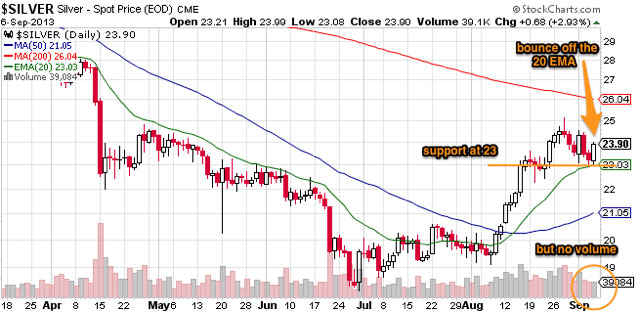 Gold this week moved from short term up to neutral. Both gold and silver prices remain above both the 50 MA and the 20 EMA, which remains bullish, although gold did close below its 20 EMA on Thursday.