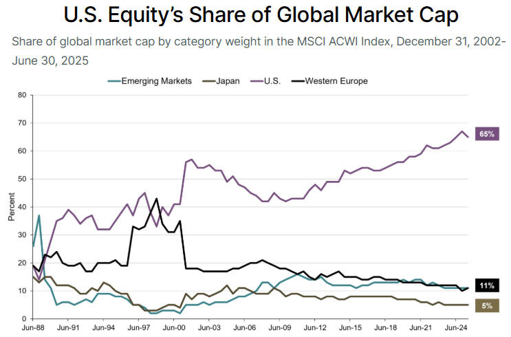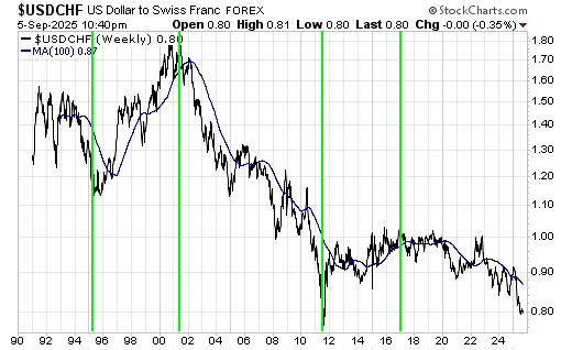 The cyclical pattern outlined above began with an 8-year downward trend in the US$ (relative to the Swiss franc) during 1970-1978. This decline was followed by an upward trend that culminated in 1985 and then a 10-year decline to a major bottom in 1995. The following weekly chart picks up the story in 1991, which means that it captures the final few years of the 1985-1995 cyclical decline and everything thereafter. The chart shows that the most recent cyclical decline kicked off at the start of 2017, so it is not a coincidence that the last time we discussed this long-term cycle at TSI was in 2017. An 8-10-year decline from the 2017 high would result in the next major low for the USD being set during 2025-2027. Hence our comment above that a turning-point window has been entered. ![]() It’s worth pointing out that knowledge of the above-described cycle generally isn’t useful for practical trading purposes, because the countertrend moves during both cyclical uptrends and cyclical downtrends can be substantial. However, it is useful to know that previous cyclical downward trends, which culminated in 1978, 1995 and 2011, had large declines during their final 12 months. If this aspect of the long-term pattern repeats, then a large decline in the USD still lies ahead. So, where does this leave us? Our view at the start of this year was that the USD was about to embark of a 1-2-year decline to complete a cyclical downward trend. We subsequently refined this view and over the past several months have written that we expected a cycle low to be set late this year at not far below the early-July low. While we continue to expect that this year’s low will be not far below the early-July low, we no longer expect this year’s low to be the ultimate cycle low. Here are the three reasons in order of ascending importance: 1) As mentioned above, previous long-term declines in the USD have involved large declines during their final 12 months. Unless the USD loses about 10% of its value against the CHF within the next three months, the decline during the 12 months leading up to this year’s low will be minor in comparison. 2) Major USD lows have occurred at 16-17-year intervals (Q3-1978, Q2-1995, Q3-2011). The same interval projects 2027-2028 for the next major low. 3) Total US equity market capitalisation as a percentage of global equity market capitalisation reached a peak of almost 70% early this year. Refer to the following chart for the details. There is evidence in capital flow data and in the following chart that a reversal has occurred. Furthermore, the trade-related policies of the Trump Administration will tend to reduce capital in-flows at the same time as they restrict goods in-flows to the US, and US equity valuations are extremely high in both absolute and relative terms. A result is likely to be a multi-year period of weakness in US equities relative to global equities, which, in turn, would mean a multi-year period during which our US$ True Fundamentals Model (UTFM) spends most of its time in bearish or neutral territory. ![]() Chart source: Lord Abbett Further to the above, we expect that the USD will make an intermediate-term low before the end of this year, but the overall cyclical decline is now expected to extend into 2027. A cycle low in 2027 still would be within the window projected by the 6-8 years up followed by 8-10 years down repeating pattern. It also would mesh with the 16-17-year cycle of major USD lows and our expectations regarding currency market fundamentals.