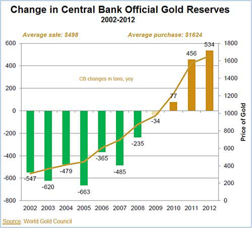 Just days ago, China's official Xinhua News Agency said the threat of default is putting China's dollar assets in "jeopardy" and called for a new international reserve currency to replace the dollar so international investors could avoid "intensifying domestic political turmoil" from the U.S. China held $1.3 trillion worth of U.S. Treasury bonds at the end of July, so they're right to be concerned about a potential default, or even deferred interest payments from the Treasury. Who can blame them for diversifying their massive $3.5 trillion in foreign exchange reserves away from the dollar and into alternative assets? And China's alternative of choice is gold. The nation is already on pace this year to import a record amount of the yellow metal, partly due to increased consumer demand. But another reason is central bank buying. China imported 861.4 metric tons of gold through August 2013. That's more than double the 361 tons it imported at the same time last year. Jewelry demand in China remains strong, as is the case throughout Asia. But with the price of gold reaching a three-year low in June, the People's Bank of China is also likely taking advantage of lower prices to exchange U.S. dollar debt for gold. And it's not just China. This is a trend among central banks around the world, as you can see in the chart below. Demand Strengthens Emerging market central banks have boosted their gold holdings steadily in recent years. Central banks globally are on track to add $15 billion to their gold reserves this year alone, according to World Gold Council data. That's the biggest central bank gold buying binge since 1964. Since 2011, Russia has been the biggest buyer, expanding reserves 20 percent by adding 171 tons of gold. South Korea expanded its gold reserves seven-fold in two years, buying 65 tons. Turkey bought an additional 371 tons, while Kazakhstan nearly doubled its reserves by acquiring another 67.2 tons. To put this seismic shift in central bank demand for gold in proper context, consider that gold accounts for an average of nearly 25 percent of international reserves among advanced economies.