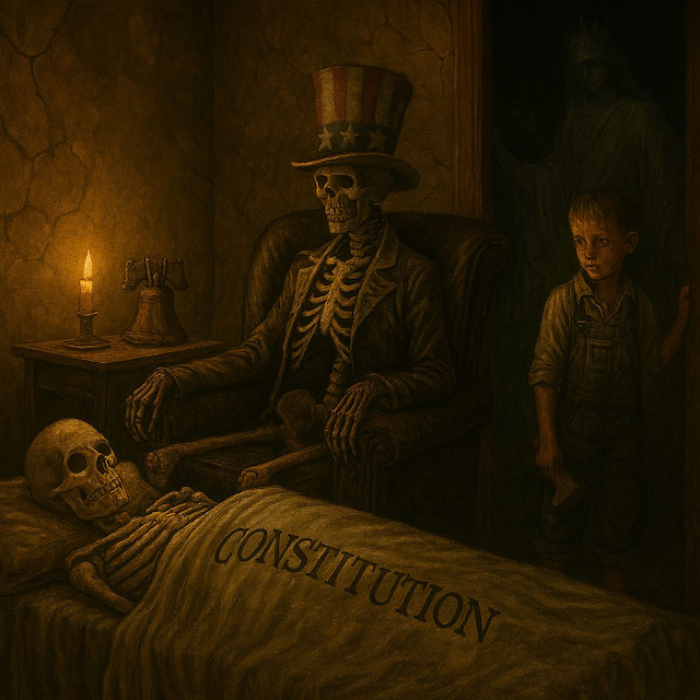 People who hate freedom and liberty are angered that anyone would choose to tell them “NO” to some dangerous, insane, and asinine idea – how arrogant and ungrateful we must be to reject their overtures and the cold chains of serfdom to an authoritarian government, the Leviathan – how dare we reject their mantel of master and the cradle to grave control they offer, under the guise of “care”. As I thought of all these matters and the manner in which so many steps have been taken to enslave us already, from the creation of the Federal Reserve to the passage of the 1964 Civil Rights Act, which has essentially acted as a second “constitution” focused upon subverting the founding constitution, the following story unfolded in my mind, a bit of an allegory focused upon the question of whether or not America will last too much further into this century and will a day ever arrive, when our children say “America” with a question mark, with America having long been erased from the history they are taught. ~ J.O.S. The room was dim, lit only by a flickering candle atop the end table beside the miniature Liberty Bell. Its flame danced, casting long shadows across the cracked walls and the skeletal forms within. Uncle Sam’s bony frame remains seated in the black leather chair, his hollow gaze fixed on the Constitution’s skeleton, which was laid beneath a frayed burial sheet labeled “CONSTITUTION.” From the doorway, a ten-year-old white boy peeked in – wide-eyed, barefoot, wearing denim overalls and a faded cotton shirt. His face was half-lit by the candle’s glow, half-swallowed by the dark. He clutched a small wooden toy in one hand, forgotten in the gravity of the scene before him. In the far corner, barely visible, the ghostly apparition of Lady Liberty hovered. Her translucent form was draped in a tattered robe, the torch she once held now dimmed to a faint ember. Her face was solemn, eyes cast downward, one hand reaching toward the boy as if beckoning him forward – or warning him to turn away. The boy’s name was Eli, and he had wandered from his bed, drawn by a whisper he couldn’t name. The grown-ups said the old house was haunted, but Eli didn’t believe in ghosts. He believed in stories. And stories, he knew, had bones. He crept down the hallway, past the portraits of men with stern eyes and powdered wigs, past the cracked glass of a display case that once held a musket and a folded flag. The door at the end of the hall was ajar, and the candlelight spilled out like a secret. Inside, he saw them. Uncle Sam, or what was left of him, sat in a great black chair. His bones were dressed in the colors of a country Eli had only read about in books – red, white, and blue, faded and frayed. His hat was still tall, but his spine was curved, as if the weight of centuries had bent him low. Beside him lay the Constitution, skeletal and still. The sheet that covered it bore its name, but the letters were cracked and peeling. Eli felt a chill as he looked upon it – not from fear, but from recognition. He had seen those words before, in a classroom where the teacher spoke softly and the lights flickered overhead. And then he saw her. Lady Liberty, or the ghost of her, lingered in the corner. Her torch was dim, her robe torn, but her eyes – her eyes were alive. They met Eli’s, and in that moment, he felt something stir inside him. Not fear. Not sadness. Something older. Something sacred. Uncle Sam turned his skull toward the boy. No words came, but Eli understood. This was a vigil. A watching. A waiting. The candle flickered. The Liberty Bell, small and cracked, sat beside it. Eli stepped into the room, drawn by the silence. He placed his toy on the table, beside the bell. It was a wooden eagle, carved by his grandfather. Its wings were spread wide. Lady Liberty raised her hand, and the flame steadied. Eli did not cry. He did not run. He stood beside the bed, beside the bones, and whispered the only words he knew, the words that seemed to best fit the situation: