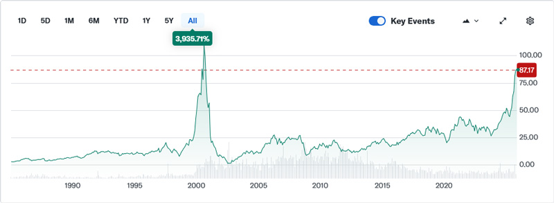 This is the wiring the internet runs on. The arteries and veins of the data world. Corning (NYSE: GLW) was the darling of fiber optics in the 1990s and into 2000. This classic American company had been a leader in specialized glass and ceramic materials for more than a century. Starting in the 1960s, they invested heavily in the idea of a glass-based cable which could transmit voice and data better than copper. That research turned into the fiber optic revolution, and it paid off as the internet took over in the 1990s. Corning became a dotcom bubble star. Take a look at the chart below, which shows the price of Corning (NYSE: GLW) from 1980 to today. (If the chart is too small, head over to Yahoo Finance for a larger version. For the time period, select “All”.) What a story this chart tells! Corning shares soared from around $9 in 1998 to a peak of $109 in 2000. A handsome 12x gain in about 2 years. Corning spent billions building new plants to satisfy seemingly infinite demand for internet cabling. But after the dotcom bubble burst, demand evaporated. It turns out the world had vastly overestimated the amount of fiber that was needed. A technological breakthrough called DWDM multiplied the capacity of fiber optics by up to 100x. Suddenly all the big telecom companies had spent way too much on their fiber optic networks. After the bubble popped, only about 3% of the fiber optic that had been laid down was necessary. (Interestingly, Google scooped up much of this “dark fiber” at bargain prices from 2004-2006.) Corning shares crashed from over $109 in September of 2000 to $1.50 in August of 2002. That’s a painful 98% fall. The stock has still not reached its dotcom highs to this day, although it’s done extremely well lately. The Inevitable NVIDIA Comparison Today NVIDIA is the darling of the AI boom. Shares have soared from around $12 in October of 2022 to $181 as I write this 3 years later. November of 2022 is when OpenAI released ChatGPT-3, which is the AI model that took the world by storm. NVIDIA chips are what AI models like ChatGPT are built with, and mostly run on. Ever since then, NVIDIA has had a historic run. Since 2022 quarterly revenue has soared from around $7 billion to $46 billion. Simply remarkable. My question is: can it last? The World’s Best Monopoly Today NVIDIA essentially has a monopoly on the hardware necessary for advanced AI models. But as we saw with Corning, innovation has a tendency to get in the way of money-printing monopolies. Engineers tend to find a way to get around expensive roadblocks. With Corning, it was a breakthrough that 100x’d the capacity of fiber optic cables that ruined the party. For NVIDIA, it could be a breakthrough that makes building and running AI models far cheaper. We’ve already had one major breakthrough when Chinese AI firm DeepSeek released its revolutionary R1 model. DeepSeek R1 offered a new, far more efficient way to build and run AI models. Aspects of it have since been adopted by all the big players. The question is, will we see a 10x or 100x efficiency AI breakthrough like we did with fiber optics? It seems inevitable. Tens of thousands of the world’s smartest engineers are currently working on making models smarter and more efficient. Eventually a major efficiency breakthrough will happen. And with China officially cut off from advanced NVIDIA chips, they have a powerful incentive to circumvent those proprietary chips. If this hypothetical breakthrough happens, I expect it will be from the East. Now, I can’t say when it will happen, or if it will even crash demand for NVIDIA chips. Maybe demand for cutting-edge GPUs will continue growing as AI takes over the planet. But maybe we’re in a bubble, caught up in the euphoria. Unfortunately, I misplaced my crystal ball. All I’m saying is that the parallels to the dotcom boom and bust are stunning. And that innovation tends to find a way. Corning fell 98% from its 2000 peak in a span of about 2 years. And it was still, fundamentally, a great company with amazing research and production facilities. But it was rough sledding for a while after the crash. To be clear, I am NOT saying to short NVIDIA. That’s a risky proposition. Eventually the time for puts may come, but I’m personally steering clear for now. I’ve already tried a few tiny puts on NVIDIA twice and failed. Timing the downfall of a tech darling is an incredibly tough job. And as we know, bull markets always go on longer than seems rational or reasonable. And that, ladies and gents, is a nice note to end on.