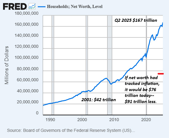 If net worth had tracked inflation, total net worth would be $76 trillion, not $167 trillion. This suggests net worth could fall by half and still have registered gains from 2001.