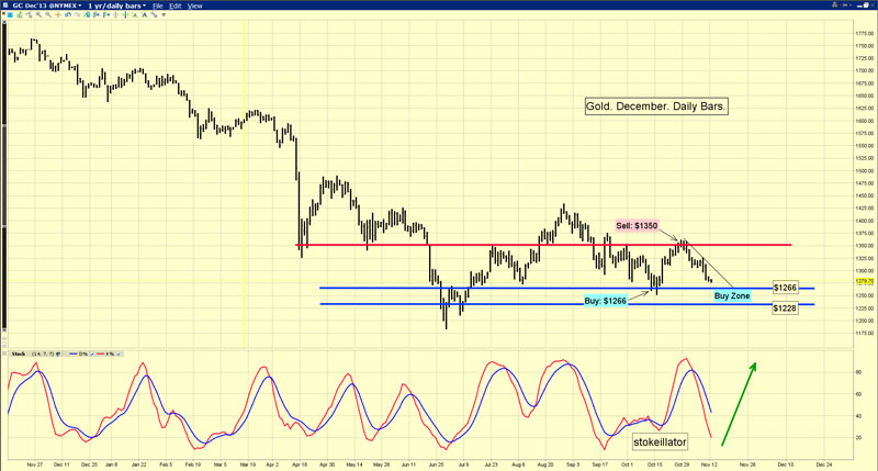 Indian national elections are scheduled to begin in May of 2014. Mr. Modi oversees the state of Gujarat. It has a population of 60 million, a 1% unemployment rate, a 10% GDP growth rate, a standard of living equal to Germany, and equity analysts in India have labelled the current Indian stock market price surge, the “the Modi rally”. They believe he will win the national election. His home state of Gujarat is recognized as one of only two states in India where government corruption has been virtually eliminated. Many Indians believe that Mr. Modi is a devout Hindu who views gold as a sacred metal. Regardless, if elected, the “Modi Man” has promised to dramatically reduce government corruption, which could open the door to an epic increase in foreign investment. That should eliminate India’s current account deficit surprisingly quickly. Also, CP Chidambaram is getting old, and he has publicly stated that perhaps it is time for the old guard to retire. Whether gold’s next big intermediate trend move is to $980 or $1680 should not be a concern for long term investors. Focus on the sizable and consistent growth of the middle class of India and China. In the shorter term, liquidity flows on US futures markets will likely continue to be a key minor trend price driver. If you are an aggressive investor, please note the following chart That’s another look at the daily gold chart, highlighting my key buy and sell zones.