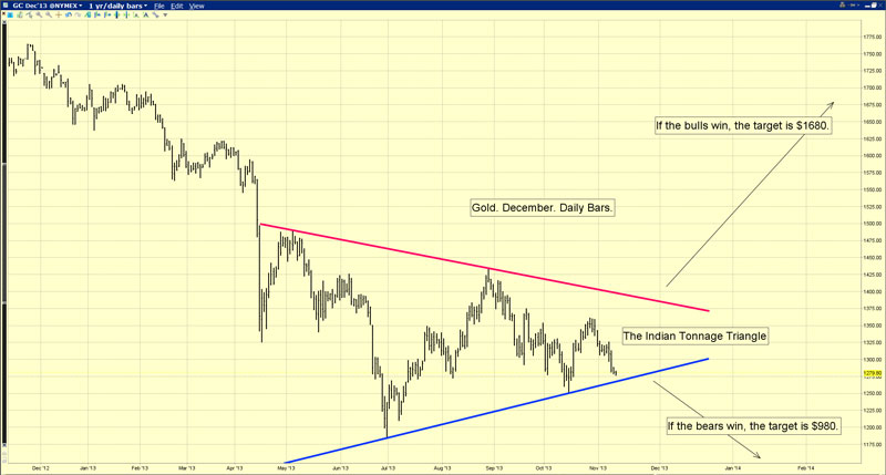 That’s the daily gold chart, and I’ve highlighted an enormous symmetrical triangle pattern. I call it the “Indian Tonnage Triangle”, which may surprise gold analysts who believe the recent price action was caused by “taper caper” talk. To understand why I’ve given it that label, I believe “A man’s got to know his limitations.” Unfortunately, I don’t think American gold bulls and bears understand their limitations, in regards to affecting the price of gold.