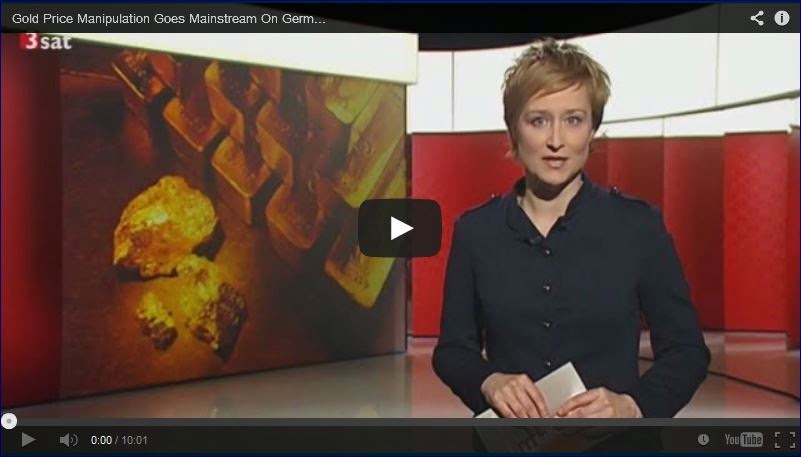 Gold Price Manipulation Goes Mainstream On German TV Public TV channel 3sat, which is a cooperation between Germany, Austria and Switzerland, broadcasted a short documentary on gold price manipulation on May 9, 2014. More and more mainstream news outlets are covering the allegedly gold price manipulation, after evidence is piling up and many other market manipulations, like LIBOR, are coming out. From the Financial Times February 23, 2014: Global gold prices may have been manipulated on 50 per cent of occasions between January 2010 and December 2013, according to analysis by Fideres, a consultancy. The findings come amid a probe by German and UK regulators into alleged manipulation of the gold price, which is set twice a day by Deutsche Bank, HSBC, Barclays, Bank of Nova Scotia and Société Générale in a process known as the “London gold fixing”. Fideres’ research found the gold price frequently climbs (or falls) once a twice-daily conference call between the five banks begins, peaks (or troughs) almost exactly as the call ends and then experiences a sharp reversal, a pattern it alleged may be evidence of “collusive behaviour”. “The behaviour of the gold price is very suspicious in 50 per cent of the cases. This is not something you would expect to see if you take into account normal market factors,“ said Alberto Thomas, a partner at Fideres. Oddly enough this article from the Financial Times was removed from their website two days after publication. One of the most extensive researches that has been done on gold price manipulation is by Dimitri Speck in his book “The Gold Cartel”. On his website there is a chart that illustrates what Fideres’ found about the London gold fix. Dimitri Speck was, amongst others, interviewed by 3sat for the documentary. I do not agree with everything that’s being said in the video, for example they state Chinese gold demand was 1066 tonnes in 2013, which is based upon numbers from the World Gold Council I happen to disagree with, or that it’s not necessary to invest in physical gold stored outside the banking system, though I thought it was worth sharing this clip with subtitles for the English speaking world. Germany is one of the few Western countries where there is a broad consensus about the importance of gold and sound money. Press the captions button (lower right corner, a double "cc", white) and choose English. Translated by Behfar Bastani. Transcript: Presenter: Good evening and welcome to the business magazine Makro. For many people, the purchase of gold represents a safe reserve for bad times. No wonder that, at the height of the financial crisis savers were queuing up at gold dealers. Throughout history, gold has served as a promise of reliability and stability. But today there are considerable doubts as to whether that promise remains valid, because an examination of gold prices reveals machinations fit for a financial thriller. Narrator: London, the most important gold market in the world. Whether the price of gold rises or falls is determined here. Twice a day, a handful of bankers confer on the phone to fix the daily price of the precious metal. Thus arises the most important reference value for physical gold, used by businesses ranging from jewellers to gold mines. There is no public oversight for the “Fixing”. Apparently, this lack of restraint has led to serious manipulations of the gold price, as pointed out by a current investigation which has detected strange price movements spanning a number of years. Rosa Abrantes-Metz: The setting of the gold fixing is, in my view, problematic. It opens the door for abuse and manipulation. There is absolutely no transparency in the arrangements made during the private phone conversations of this small group of participants as they decide what the price of gold should be. Narrator: Experts have long complained that this system is particularly susceptible to manipulation. Only five banks participate in the London gold fix, thus far including the Deutsche Bank. In the more extreme futures markets, where bets are made on gold price developments in future months, the quantities that exchange hands are of quite different magnitudes. Folker Hellmeyer: We have a situation where this market is dominated by three essential players, three banks, in the USA. These banks have a market share on the order of 80 percent. In other words, we are talking about an almost monopolistic structure which of course also provides the power to manipulate the market. Narrator: And which power is apparently being abundantly used. The futures market, intended to provide predictability and stability for future prices, is controlled by the following three banks: HSBC, Citibank, and JP Morgan. Their tool: paper gold securities. Thorsten Schulte: It is possible to simply sell scraps of paper, thereby creating fear, especially fear among those who possess gold in its physical form, and who may then arrange to sell their metal, eventually resulting in such a a wave of fear … Narrator: The gold price has been attacked in this fashion time and again, often with massive price declines within a matter of a few minutes. Yet, there is quite a bit more to the story. Dimitri Speck: Gold is the opponent of debt based moneys, i.e. currencies, and in particular the US Dollar. Therefore, the US Federal Reserve has an interest in a weak gold price, and the US government protects the manipulation of the gold price by the private banks. Narrator: For years, the US Federal Reserve has served as the lender of last resort. Gold must be weak if a loss of confidence in the US Dollar is to be averted. It has been difficult to prove that this is a rigged game with a stacked deck, but if the gold market manipulations are indeed encouraged in addition to being condoned, that would explain why oversight bodies have thus far turned a blind eye to it, despite years of massive conspicuous activities in the futures markets, as with 