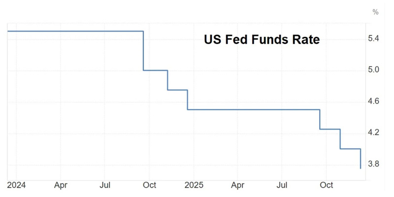 But that’s just the beginning of a very complex process. Let’s start with the fact that the Fed has already been lowering rates since September 2024: But longer-term rates have gone the other way, with the US 10-year Treasury yield (the reference rate for mortgages and car loans) rising slightly since the start of this easing cycle.