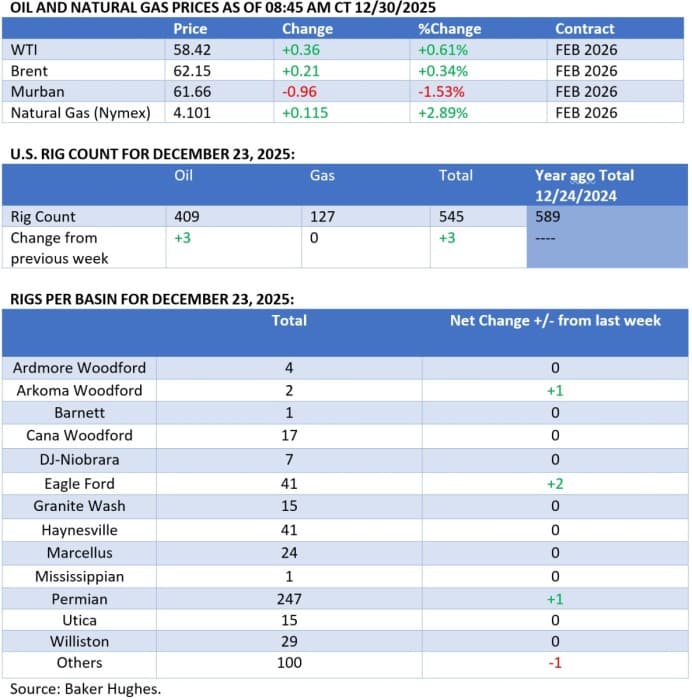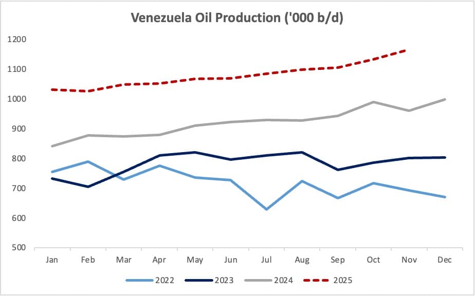 - Donald Trump’s maximum pressure strategy on Venezuela is finally starting to impact Venezuela’s oil production, with state oil company PDVSA beginning to shut down wells in the Orinoco Belt amidst swelling inventories and ongoing tanker seizures. - Venezuela’s oil production has been continuously growing in 2025, with the November average of 1.165 million b/d representing a 20% year-over-year increase. - According to Bloomberg, PDVSA plans to reduce output in the Orinoco Belt by at least 25% to 500,000 b/d, which could shave some 15% off Venezuela’s total liquids production. - Venezuela will curb production at its heaviest wells first, with extra-heavy Junin becoming the first basin to be slashed, keeping lighter fields that require less diluents operational for as long as possible. - Despite ongoing VLCC seizures, flows of diluents to Venezuela have not fully stopped, with Russian suppliers delivering four tankers of naphtha in December to date, however storing the upgraded bituminous crude is becoming a deal-breaker for PDVSA. Venezuela Starts Cutting Production as Trump Ratchets Up His Strangling Strategy Market Movers - Australia’s top energy producer Woodside Energy (ASX:WDS) signed a 9-year term LNG supply deal starting from 2030 to deliver around 5.8 billion m3 of liquefied gas from its Louisiana LNG project. - US oil major Chevron (NYSE:CVX) has reported first oil from its South N’dola project offshore Angola, aiming to produce 25,000 b/d of crude and 50 MMCf/d of natural gas once the field reaches peak output. - Russia’s government has extended its deadline to sell ExxonMobil’s (NYSE:XOM) 30% stake in the Sakhalin-I project by another year, potentially indicating Moscow’s readiness to re-integrate the US oil major into Sakhalin’s new shareholding structure after the Russia-Ukraine conflict ends. Tuesday, December 30, 2025 In the relatively uneventful period between Christmas and New Year, Russia-Ukraine peace talks were the main geopolitical driver. Ukraine’s alleged targeting of Putin’s residence and Moscow’s pledge to change its negotiating strategy brought yet another wave of disappointment to those eyeing a resolution to the four-year-long conflict, capping ICE Brent at $62 per barrel. An all-out-war in Yemen could provide a new geopolitical risk to oil, however, the physical impact thereof remains questionable. Saudi Arabia Mulls Extending Price Cuts. Saudi Arabia’s national oil firm Saudi Aramco (TADAWUL:2222) is expected to cut its formula prices for February-loading cargoes going to Asia by up to 30 cents per barrel, slashing prices further despite dipping to a 5-year low last month. China Launches 2026 Crude Import Season. China’s Commerce Ministry has issued its first batch of crude oil import quotas for 2026, allocating 206 million metric tonnes or 4.14 million b/d to qualified refineries, putting the overall allocation some 8% higher than a year ago as new private refiners boost runs. India Seeks Billions from Key Upstream Players. The government of India is seeking more than $30 billion in compensation from a consortium comprising Reliance Industries and BP (NYSE:BP), claiming they failed to produce promised volumes from two deepwater fields, D1 and D3. Kazakhstan Curbs Output on CPC Damage. Oil production in Kazakhstan dropped by 6% month-on-month in December to 1.93 million b/d, following a November 29 drone attack on the CPC terminal on Russia’s Black Sea Coast, with curbs mostly coming from the Chevron-operated Tengiz field. Nigeria Eyes Asset Divestments to Boost Coffers. Nigeria’s state oil company NNPC is reportedly planning to sell stakes in some of its oil and gas assets, offering potential bidders to disclose their interest by January 10 despite ongoing protests from the African country’s powerful trade unions. Russia Extends Gasoline and Diesel Export Ban. Russia’s government has extended its temporary ban on gasoline exports until 28 February 2026 as a precautionary measure vis-à-vis Ukrainian drone strikes, having already halved exports of the transportation fuel to 50,000 b/d in 2025. Ghana Restarts Its Key Refinery After 5-Year Hiatus. Ghana’s state-owned 45,000 b/d Tema refinery has resumed operations this week after a 5-year hiatus as a means to combat soaring imports of petroleum products from Nigeria’s 650,000 b/d Dangote refinery that sent 30,000 b/d of fuel in 2025. LNG Canada Still Not Flowing the Way It Should. Canada’s first LNG export plant, Shell-operated (LON:SHEL) LNG Canada, struggles to make good on initial promises as there has been no cargo loading LNG in Kitimat in three weeks despite the operator claiming both liquefaction trains were up and running. Beijing to Limit Copper and Alumina Smelting Capacities. China’s ‘anti-involution’ campaign to combat overcapacity will extend into the country’s copper and alumina industries as Beijing vowed to tighten oversight over the metal industry, with both copper and alumina hitting all-time highs in 2025. Petrobras’ Strike Might Spin Out of Control. Brazil’s Superior Labour Court has mandatedthat staffing levels remain at a minimum of 80% across all Petrobras (NYSE:PBR) facilities as the Brazilian state oil firm’s largest trade union rejected its latest proposal to end the ongoing three-week strike. Syria Starts Exploration Campaign for More Gas. Syria’s Petroleum Company announcedthat the war-torn country will resume exploration drilling to boost domestic gas production in Q1 2026, planning to drill four wells around the capital city of Damascus. US Exporters Boost Pre-Christmas Exports. Delayed weekly data from the US Energy Information Administration show that American exports of petroleum products soared to a new all-time high of 7.8 million b/d in the week ending December 19, taking the usual year-end destocking to a new level. Market Expects Lithium Slump in Early 2026. China’s passenger car association expectsdemand for li