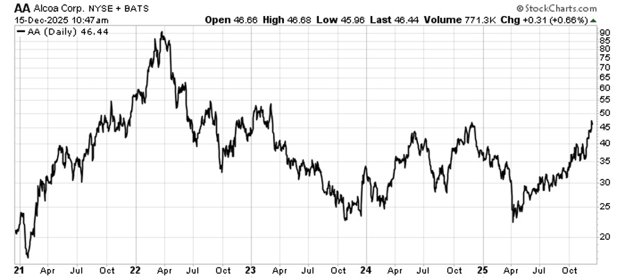 What’s interesting today is that the surge of data center construction will increase demand for aluminum…and electricity. Higher power prices mean higher aluminum prices. Add to that demand for aluminum from those same data centers and we get a major market distortion. Higher aluminum prices are going to hit consumers in weird places. Cars, windows, doors, siding, beer cans, and kitchen foil are all going to go up in price. That’s a hidden form of inflation that will hit us in the wallet. Analysts across the spectrum expect a 16 million metric ton shortfall within the next three years. To put that in perspective, the U.S. consumes about 5 million metric tons per year. Sixteen million metric tons is about 23% of global annual demand. That will dramatically impact prices for the humble metal. Shares of aluminum producers and smelters are already rising, as you can see in the chart of Alcoa (NYSE: AA) below: