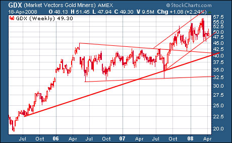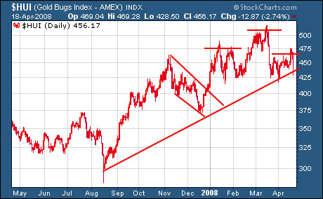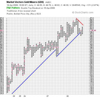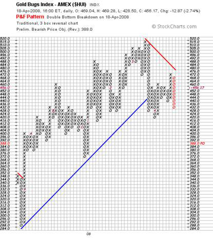 Next up is the point & figure chart for the Hui. It shows a double bottom breakdown on April 18, 2008. It gives a bearish price projection of 388, which is a ways below. Note it is just below the 400 price level mentioned above. The Hui chart does not jibe with the GDX or XAU charts, so either the Hui is correct or the others are correct. We await the outcome, which is why we took profits on most of our positions this past week. It seemed the prudent thing to do. There appeared to be a shift in momentum so we took the money and ran. The point & figure chart for the Xau follows the Hui