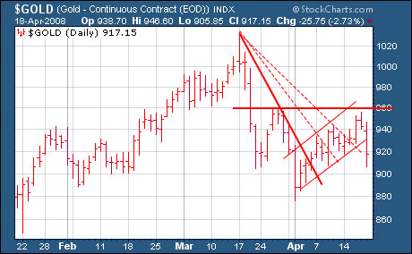 Up next is the daily gold chart of the last three months of price action. The horizontal overhead trend line at $960 offers stiff resistance and will have to be broken above and held on a two day closing basis before any assault on $1000 is even possible, let alone doable. Price can be seen to have recently broken below its rising price channel. The $880 price level is looming below. If broken through, a test of the $800-$850 level is likely.