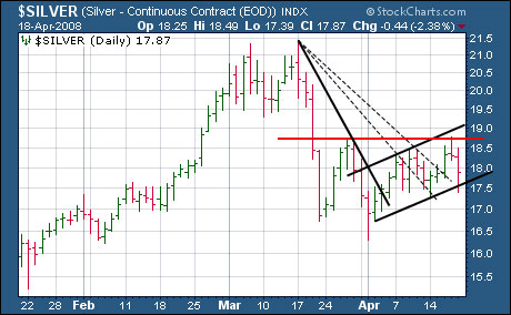 The recent rally up was on declining volume, which is a sign that buying pressure and momentum is waning. Caveat Emptor. Also, there may be an overall commodities correction waiting to take hold. The action of the euro and the dollar will be most telling. If the euro rises against the dollar - gold and the other commodities will go up. If the dollar rises against the euro, gold and the other commodities will go down. Watch the currencies for clues as to the short term direction of the gold market. Intermediate and longer term trends still remain strongly in force - up. Silver Silver was up fractionally for the week. This is a positive divergence, although minimal and it needs further confirmation. The daily chart shows the bottom trend line support area being tested. On the weekly chart a negative MACD cross has been put in.