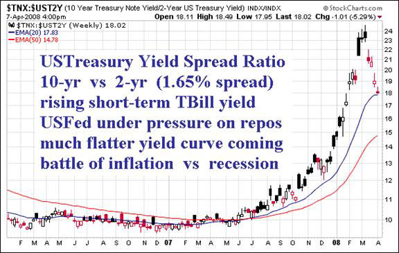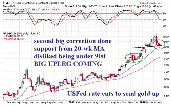 The USFed has essentially become a bond pawnbroker in a bad neighborhood dominated by white collar criminal looters, where the police get ripe payoffs. The compromised central bank has limitations, and soon could run low on balance sheet quality. They stepped into the banking void and filled it. Unfortunately, they did so with reckless abandon as they exposed the corrupt nature of JPMorgan, its extreme vulnerability, and has encouraged those with access to the USFed lending facility windows to execute similar raids. This is a moral hazard of another ugly side, yet high order. Next comes USGovt massive stimulus, larger than the puny $600 per household, construction finally of the New Resolution Trust Corp in the mortgage complex, and grand spillover into the USEconomy. The USTreasury yield curve has flattened lately, explained in the April HTL issue. The USFed must juggle its balance sheet. If foreigners do not abandon the USTreasurys and USDollar, the yield curve will flatten further. A recession would keep long-term bond yields down, but also motivate foreign sellers. THE NATIONAL BALANCE SHEET IS WRETCHED. So an increasing number of banks have negative core capital, an increasing number of homeowners have negative home equity, and an increasing number of car owners have negative car equity. The USGovt runs gargantuan federal deficits, and the USEconomy runs mammoth trade deficits. The entire USEconomy is fighting desperately to avoid insolvency and bankruptcy. The USFed and USGovt response will be a powerful wave of monetary inflation for a few years. The result will power gold and silver to unexpected heights. A detail. Did anyone notice that the March Jobs report details? Even though at MINUS 80k jobs in the non-farm payroll count, a hefty job loss to be sure, it could have been worse. The final tally was heavy doctored by the lunatic Birth-Death Model, which added 142k jobs from small businesses supposedly thriving in this environment. Are you kidding me? The March Jobs should have been MINUS 222k jobs. The same was true of February. Its B-D Model added 135k jobs from a thriving small business climate. Are you kidding me? The USFed must be panicking. They will cut rates again and again, until they have no ammunition left. They will soon print money and monetize their refunding operations. The USDollar will be under siege. But fortunately for the downtrodden buck, foreign economies are slumping. Foreign central banks will also be cutting official interest rates. The USDollar will find support from global rate cuts, which will send gold and silver prices soaring again, but on more continents. It is basically 'Inflate or Die' still. Gold Will Ride the U.S. Fed Surfboard Gold was ambushed in mid-March. The motivated authorities were sweating bullets. They ordered banks to deliver margin calls. Speculators led by hedge funds were forced into broad liquidation. However, the trend is intact. The moving averages are rising. Support has been found. The gold price had a deep reluctance to stay under the 900 level. Stability has returned, enough to start the creation of a new base. The big breakout since August has now registered two noticeable corrections in classic style, a small one followed by a large one. With nothing having been solved on US bank problems, and USEconomic recession worsening, the additional stimulus and rabid monetary growth will send gold flying again soon. Look for an assault on the 1100 level within two or three months.