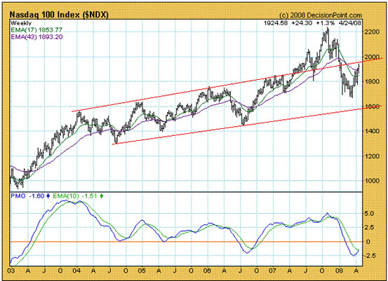 The conclusion to which I arrived is that Mother Nature will very likely swat us aside, as if all of humanity was nothing more than an irritating gnat. It was then that I came to focus on the meaning of the word "Islam". In the religious sense, Islam means submission to the will of God and obedience to His law. Now, before any reader goes off with the pixies and starts imagining that the purpose of this article is to push a religious viewpoint, let me hasten to clarify that there are issues surrounding the very meaning of the word God, and there are various ways of looking at religion; and religious "dogma" is not a particularly constructive thought paradigm. It leads to clashes of culture - which is probably one reason we are experiencing the current so-called Clash of Civilizations. My mind is operating at a high level here. I am not focusing on any particular dogma. What I am focusing on is that, sometimes, (most times) it pays to listen to what the other guy has to say. Arguably, if politicians across the planet are going to continue to try to control or block (as opposed to submit to) the forces of Nature, we will likely be wiped out. So let's come down to earth again. What's happening at the coalface - in particular, at the coalface of the most powerful nation on the planet? Well, in terms of Schumpeter's model there is no shortage of evidence (at face value) that the US is starting to behave as if the word capitalism no longer exists in the lexicon of politicians and industrial leaders. There is even an argument that the Bear Stearns debacle was specifically orchestrated to enable JP Morgan to protect its balance sheet. (See www.sandersresearch.com for an article published on April 24th 2008) It seems that at one end of the spectrum we might be witnessing a form of financial terrorism, and at the other end we might be witnessing a move for the US to become a welfare state. In terms of this "model" it could be argued that the entrepreneurial spirit of the USA is being smothered. An interesting possibility, and seemingly plausible - until one focuses on the paradox of the Nasdaq, which can be seen from the chart below (courtsydecisionpoint.com)