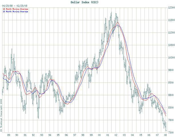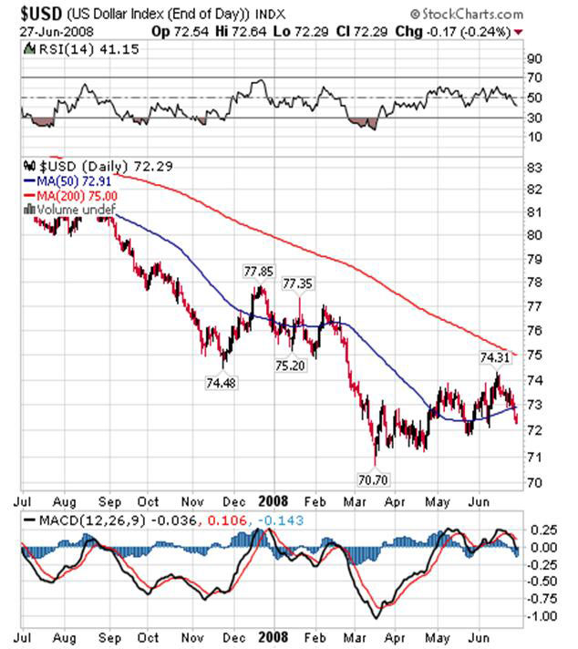 The reason for the decline in the dollar is quite simple: the Administration and the Federal Reserve have been grossly mismanaging the US economy. This mismanagement has gone on for decades with very few interruptions. Paul Volker was an interruption who managed to exercise his will even with an administration that created debt in large quantities. He was able to do so because the US was just making the shift from creditor nation to debtor nation, and the dollar was the reserve currency for the world. That luxury no longer exists as the United States in by far the largest debtor nation the world has ever seen. Until recently most of that debt was financed by foreigners but that is no longer the case as the greenback loses its reserve status. The Fed is now increasingly forced to cover the growing gap with the printing press and, as a result, the money supply now increases at a large 16% per year. Other countries assisted by printing more currency, and the result is that we now have a world-wide inflation. The Fed’s only hope is to control the situation and slowly inflate away the massive debt, along with American purchasing power, but it is a very dangerous game. The dollar is now a great gauge for inflation. As long as it devaluates, you know that inflation is present but on the other hand you are devaluating the reserves of foreigners who are stuck with massive amounts of US dollars and bonds. The Arabs and Chinese are great examples and there has to be a point, some level in the US Dollar Index, where they decide they’ve had enough and dump dollars regardless of the consequences. It is my belief that we are now very close to that level. My line in the sand has been 70.44 and it was tested back in March. Since then the greenback has created the appearance of a rally but I think that is an illusion; the dollar has really been undergoing a stealth distribution, sort of a last chance saloon. The range of that distribution has been and remains 70.44 to 75.47. Break out above it and it will be deflation, break out below it and it will be increased inflation and maybe even hyperinflation.