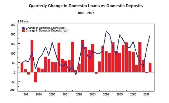 LEAP/E2020 Alert: Breaking phase ahead for the global financial system in 2008 The rapid aggravation of the global systemic crisis as its phase of impact unfolds [1] has brought our researchers to estimate that the contemporary global financial system will reach a breaking phase in the course of 2008. Crisis follow-up indicators now show that we should no longer only fear the failure of some large financial institution (and of many small ones) in the US first and the in the rest of the world (cf. GEAB N°19), but that the global financial system itself is structurally hit. The network of global central banks' repeated incapacity to control the "credit crunch" when the two historical pillars of the contemporary global financial system (a US economy in recession and a US dollar in decay), reflects the growing surge of centrifugal forces within this very system. Indeed it is no more a matter of competence or of magnitude of the corrective actions implemented by central bankers. These times are over since summer 2007 and, according to LEAP/E2020, we are now witnessing an increasing divergence in economic interests among the different components of the global financial system. The expected failure of the Fed's most recent attempt to coordinate a joint action of the main central banks in order to feed the banks in US dollars [2] , is particularly revealing. This action meant to restore confidence in the financial system by two means: . reinstating the now moribund inter-banking market, by proving the existence of a "joint force de frappe (strike force)" of global central banks. . enabling large financial institutions in distress to anonymously restock in US dollars, in exchange of their assets being accepted as discount window collateral (i.e. worth their value some months ago, when they were still worth something) [3] . Of course the first goal is predominant, as reinstating of interbanking market is the only means to bailout banks in distress in a sustainable manner. However, it is already clear that the target has failed to be reached [4] . The LIBOR (London Interbank Offered Rate), a key indicator of the health of the interbank market, has not moved an inch from its highest levels ever reached [5] . "Psychologically" speaking, the global stocks decline recorded after the action of the central banks was announced, proves this if any message went through, it is that the situation for large US banks is even worse than announced in the past months [6] . Concentration of US Commercial Bank Derivatives on 09/30/2007 - Source Federal Deposit Insurance Corporation (FDIC) - Comment: 7 banks [7] concentrate 98% of all derivatives, i.e. USD 155,400 billion; while the other 929 banks own 2% only, i.e. USD 2,900 billion. According to LEAP/E2020 research team, it is already a fact that after it lost control over interest rates (cf. GEAB N°16), the US Federal Reserve has now lost two more of the attributes that characterized the post-1945 global financial system: its credibility as a proactive player capable of influencing heavy market trends [8] , and its capacity to organize and drive global central banks altogether along its own rhythm and goals. In doing so, it has just lost the ability to steer by itself the entire global financial system, an ability it has gained after 1945. Even though today, financial markets are mostly receptive to the loss of the first attribute [9] , our researchers estimate that it is the loss of the second attribute (and the impact on the system's leadership) which will result in the global financial system's break sometime in the course of next year, probably by summer, when the effects of the ongoing US recession will start being fully felt and when Asians and Europeans will decisively be compelled to impose their own priorities to the "Fed-pilot". In this 20th issue of the GlobalEurope Anticipation Bulletin (December 2007 issue), our team describes in detail the characteristics of the growing divergences between the four main central banks (US Federal Reserve, European Central Bank, Bank of England, Swiss national Bank). According to LEAP/E2020, these crucial trends, coming at a time when the entire magnitude of the US recession effects has not yet been reached (in Asia and the US in particular), illustrate the rapid increase of centrifugal forces which, according to our anticipations, will lead the contemporary global financial system to a break point by summer 2008. This break point will entail numerous disastrous effects for the world's largest financial institutions, in particular for all those who do not yet fully understand the meaning of ongoing tendencies and therefore who remain largely involved in the US dollar system currently imploding. These institutions will experience, to a much larger degree, what those who failed to anticipate the subprime crisis experienced, now being on the verge of disaster [10] . Meanwhile, for depositors and investors, this breaking phase will convey risks of considerable loss comparable to the two previous breaking periods (1929 and the years that followed [11] , and 1973 and the end of the 1970s). According to our researchers, the ongoing rupture is even more disastrous than the two previous ones due to a disproportionate importance of the financial sphere in contemporary economy. For that matter, LEAP/E2020 comes back on this aspect and describes possible protections further in this 20th issue of the Global Europe Anticipation Bulletin. US banks quarterly change in domestic loans (in blue) versus domestic deposits (in red) - Source FDIC - Comment: There is a historical disconnection between loans and deposits since 2006, illustrating the dangerous spiral US banks have entered By summer 2008, it will be possible to distinguish more clearly the lines along which the global financial system will reorganise once the break point has been reached. According to our team, it is a fact that the Europeans (the Eurozone essentially), togeth