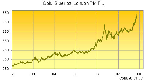 After all, a profit's not a profit until it's in your pocket. Not unless you're an investment banker holding subprime mortgage bonds in your "Level 3" accounts, that is. But there's no profit even "marked to model" for last week's gold buyers yet. So should they quit now while they're only out by $60 per ounce? The last blow-off top in Gold Prices - the spike of May 2006 - cost new buyers 20% of their investment inside six weeks. At today's prices, that would take us back to $680 per ounce. Five months later, in Oct. '06, those gold buyers came to stand one-fifth short of break-even once again. And it took until Sept. this year to regain last May's level of $725 per ounce. Can you now afford to sit on a loss in gold - earning zero in yield and paying for storage - until Feb. 2009...? We don't pretend we can see the future here at BullionVault. Blackjack and bridge are more fun than tarot, to our mind. But in lieu of tea-leaves and a crystal ball, we do like to study the past. And if you won't study history when you're investing your money, just what do you plan to study instead? To put that question another way, what else might new gold investors have bought last week that would have made them a quick profit instead? The "smart money" of professional and institutional fund investors is surely shouting an answer. "Buy Treasury bonds," cries Wall Street and London, "most especially short-dated Treasuries! "Quick, buy! Buy! BUY! before the Bernanke Fed takes its scissors to US interest rates again and tries to prop up the mortgage market with a fresh dose of cheap money!" But if it's cheap money you want, then the US Dollar is already cheaper than it's ever been before in history. And glancing at what happened before once more today, we wonder whether Treasury-bond buyers might not want to take a longer-term view, too...