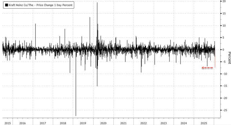As a result of the 8K filing, Kraft Heinz shares were down 7.5% in premarket trading on Wednesday. If losses extend and hold through the cash session, this would mark the largest daily decline since May 18, 2022, of -9.5%.