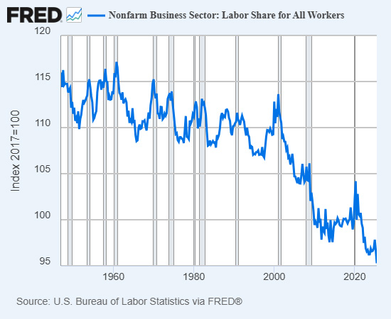 The past 50 years have seen productivity gains flow to capital (corporations and owners of assets) at the expense of wage-earners. This means households and small businesses must service debt from a shrinking share of the economy. As a result, borrowing more becomes increasingly risky for both borrower and lender.